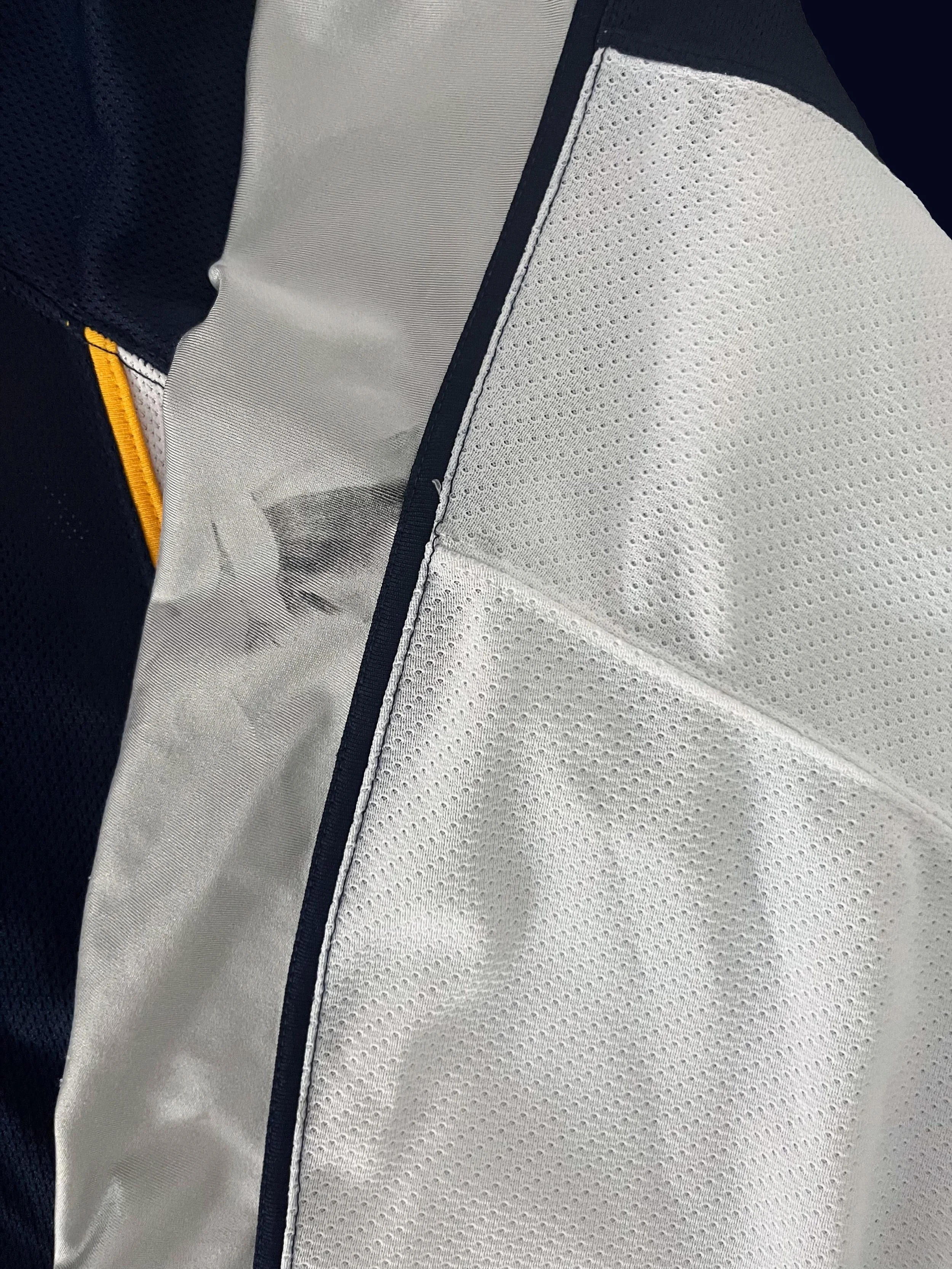Radulov’s jersey has solid wear for a jersey of this style with board burns, loose threads, repairs, two unrepaired holes, and some stick/puck marks