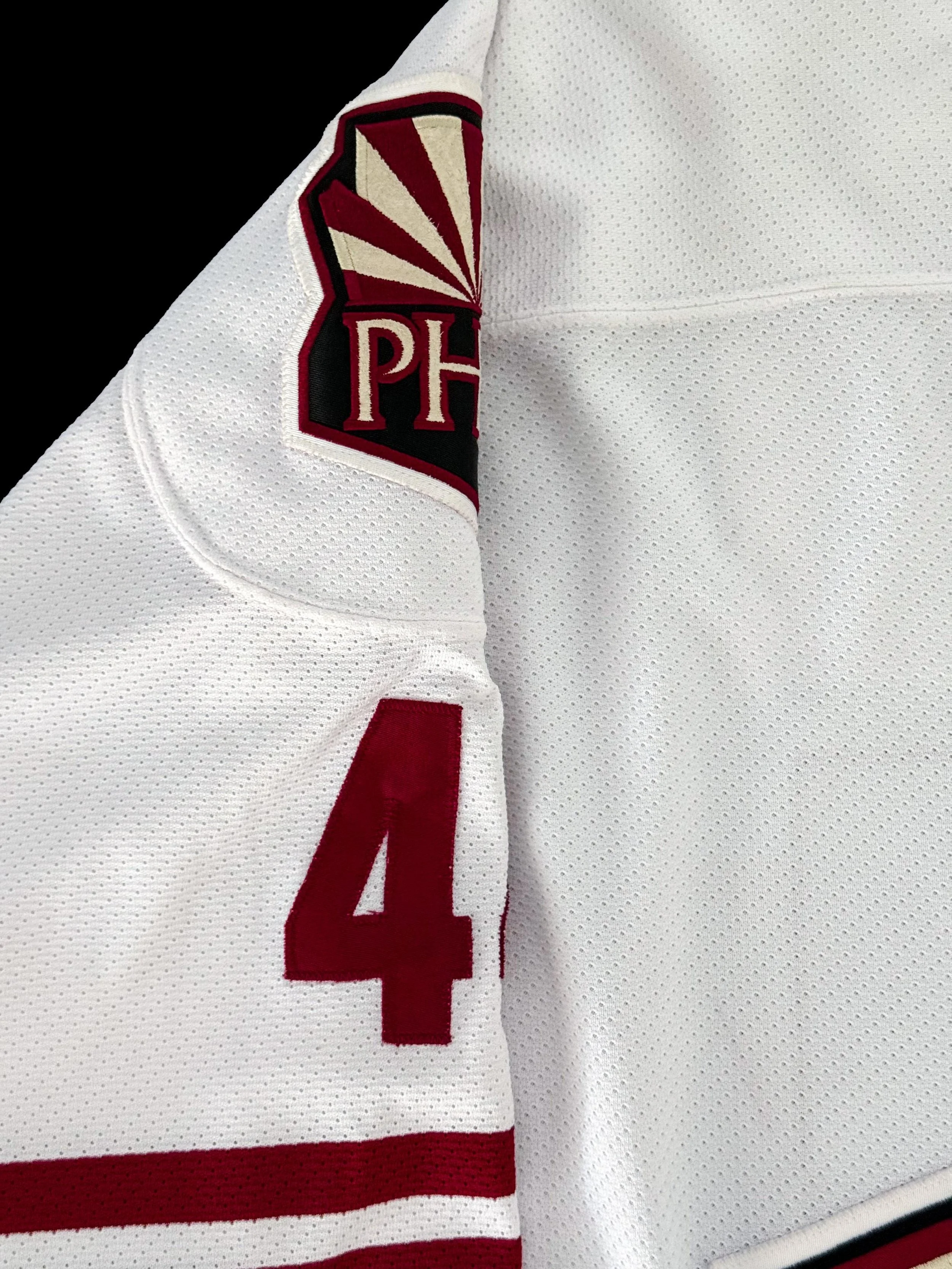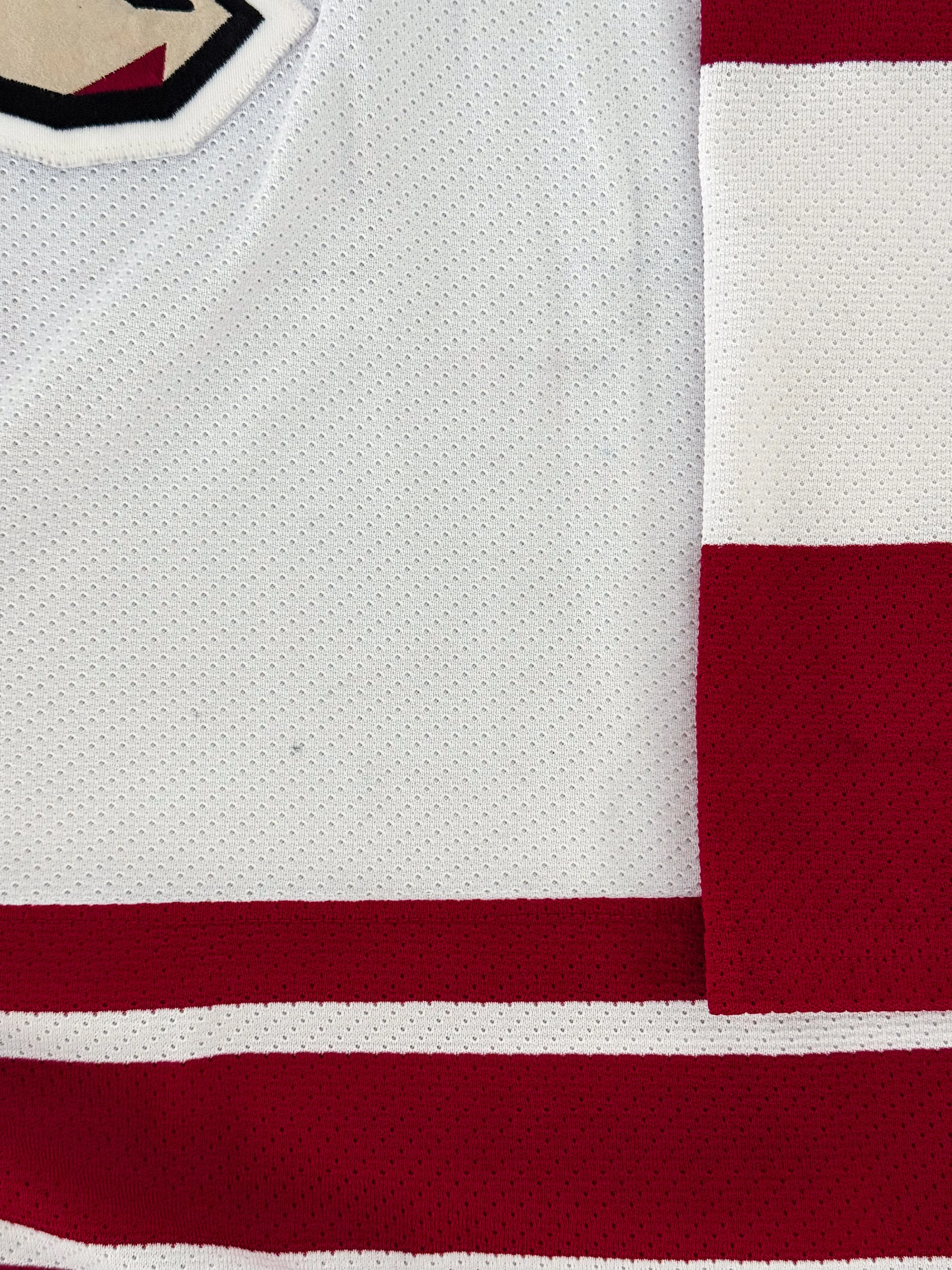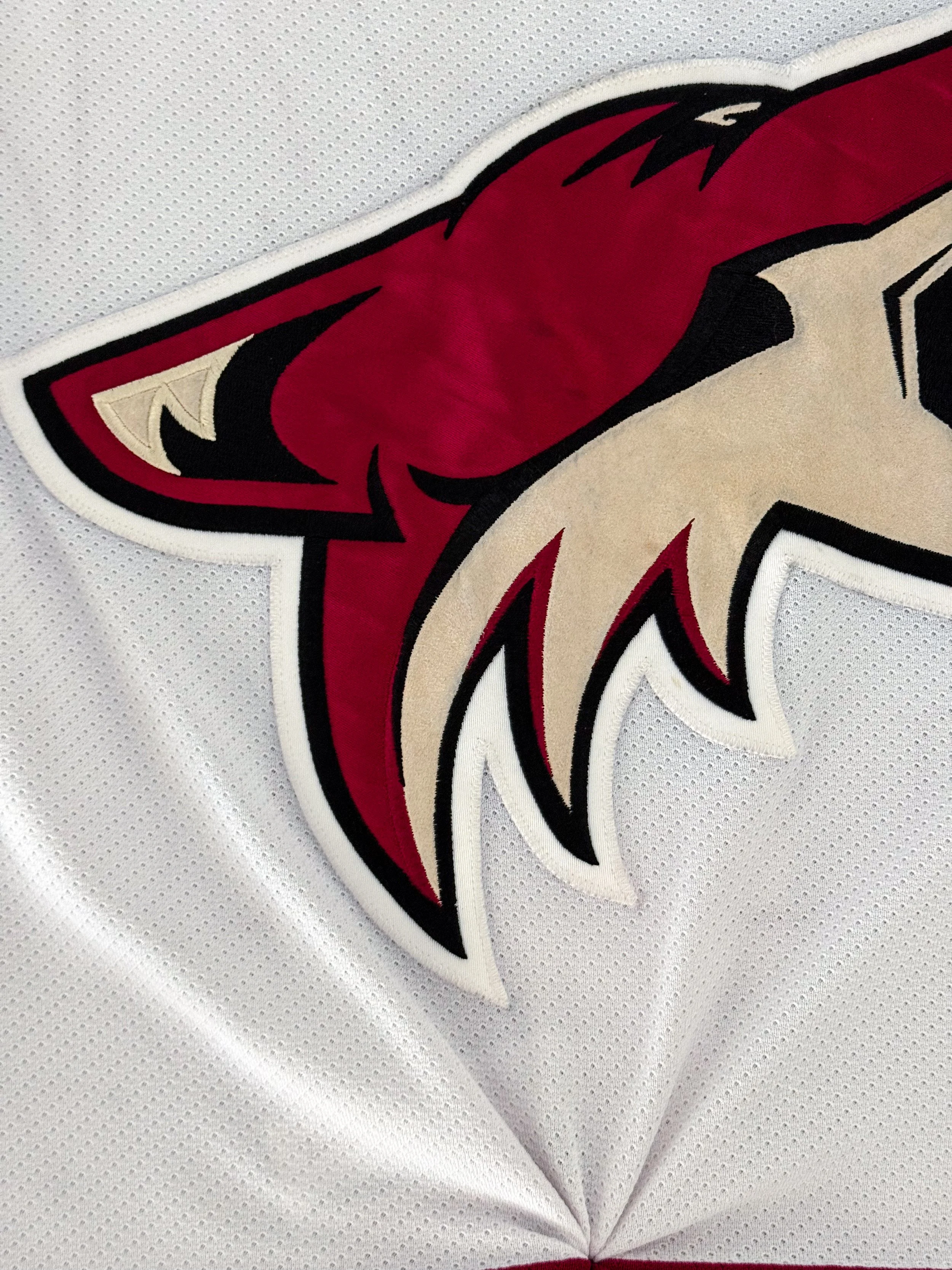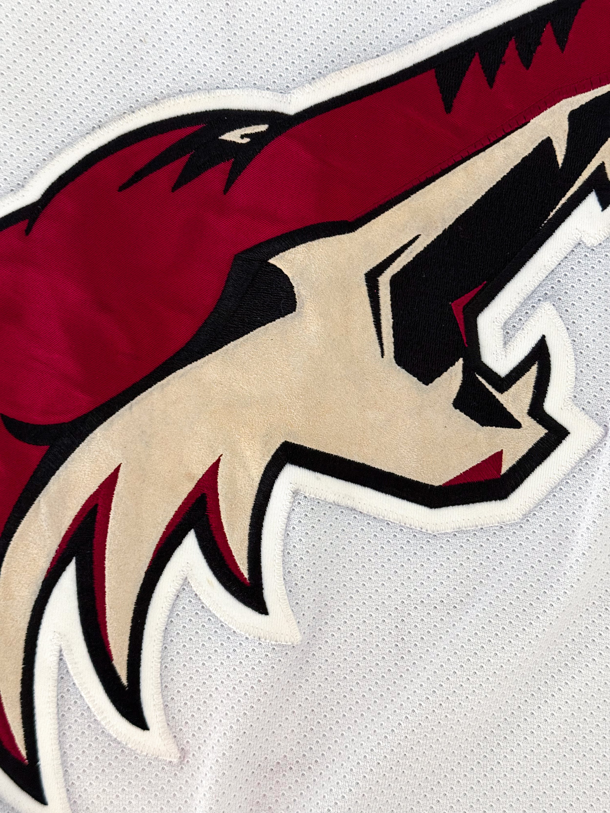 The Coyotes were also in the first year of their rebrand from the kachina to the howling coyote and brick red and white. While the kachina eventually won out as the favored logo and look of the two, these white jerseys with the brick red stripes remain my favorites of the howling coyote era.