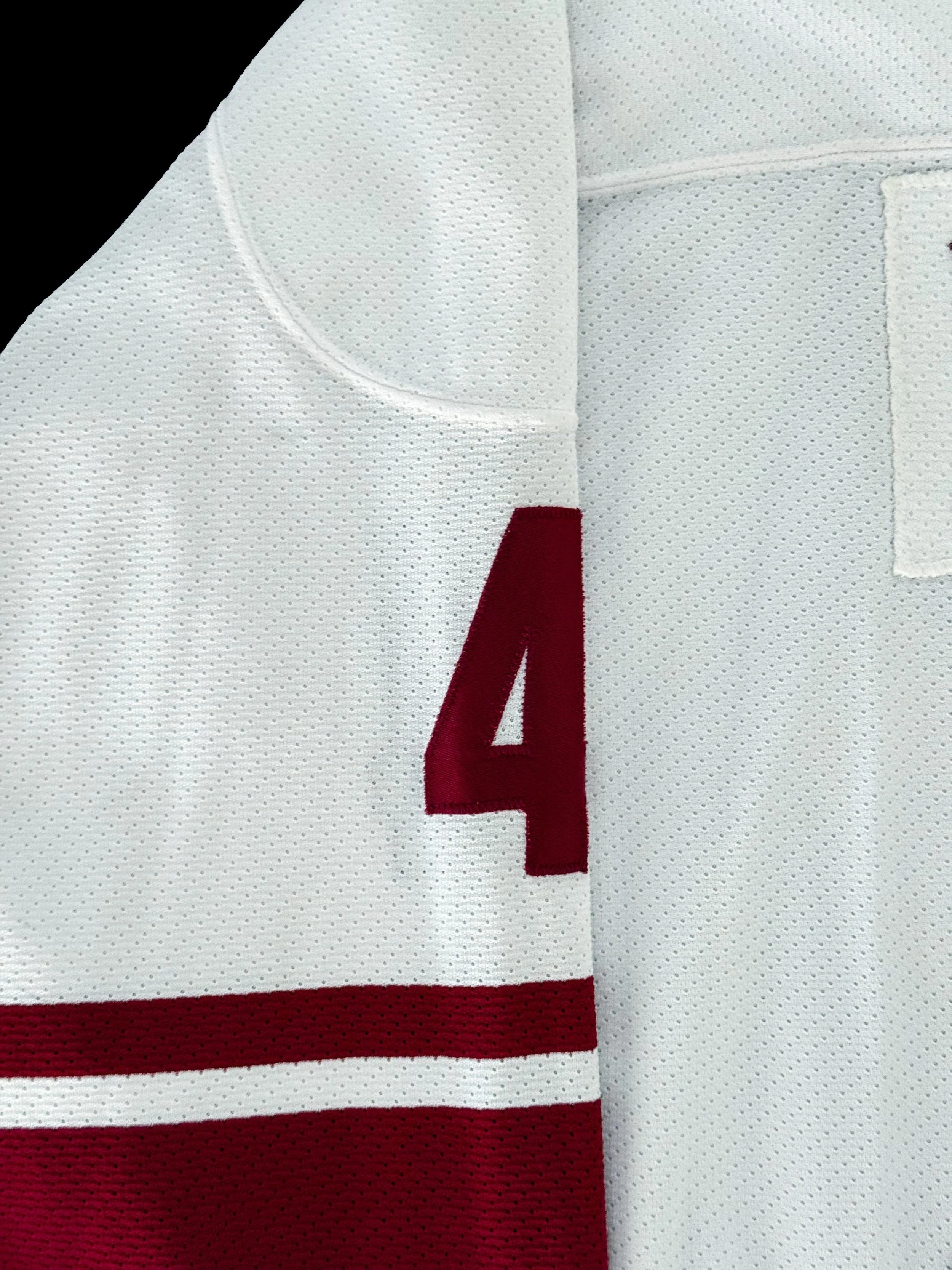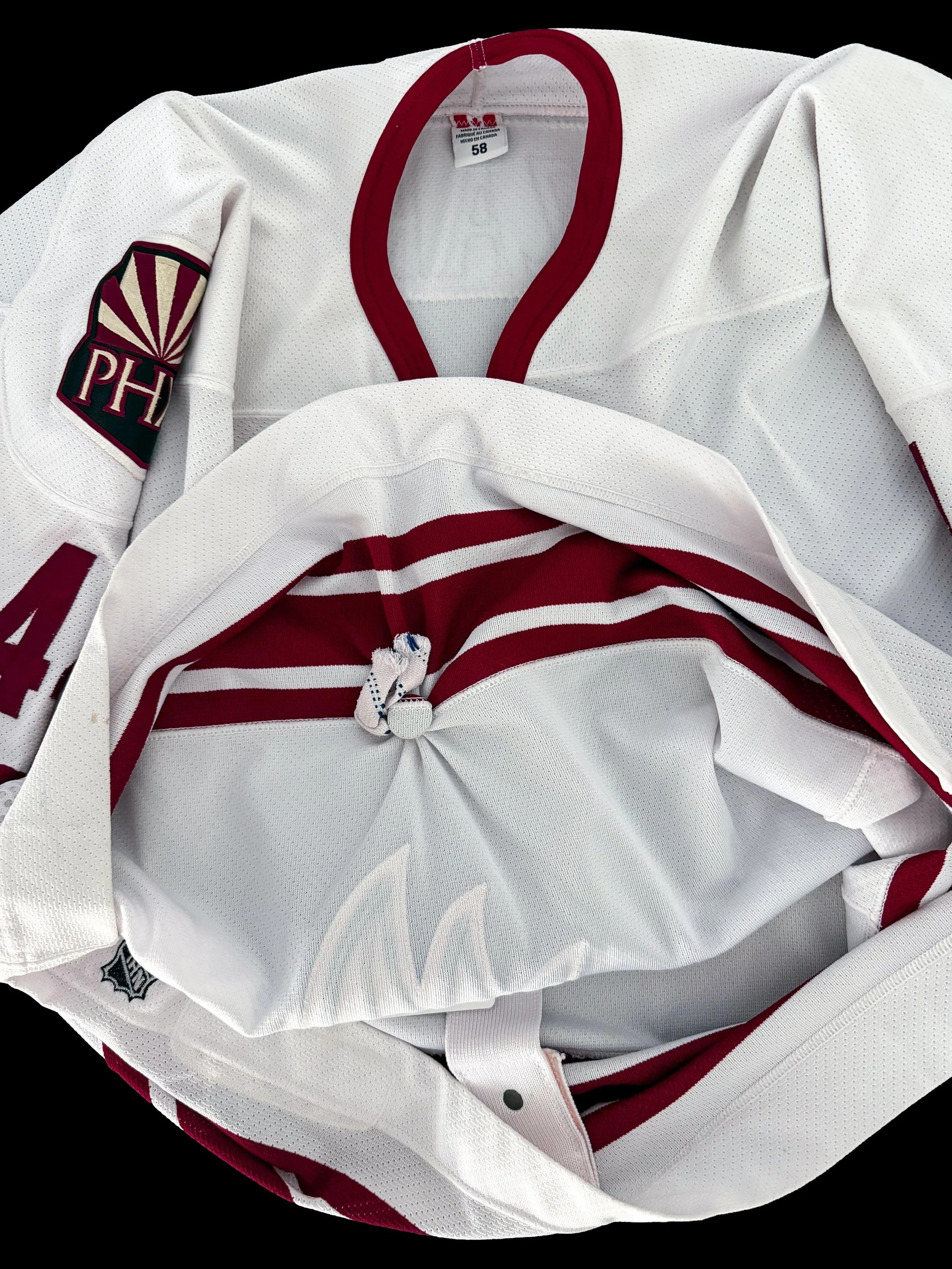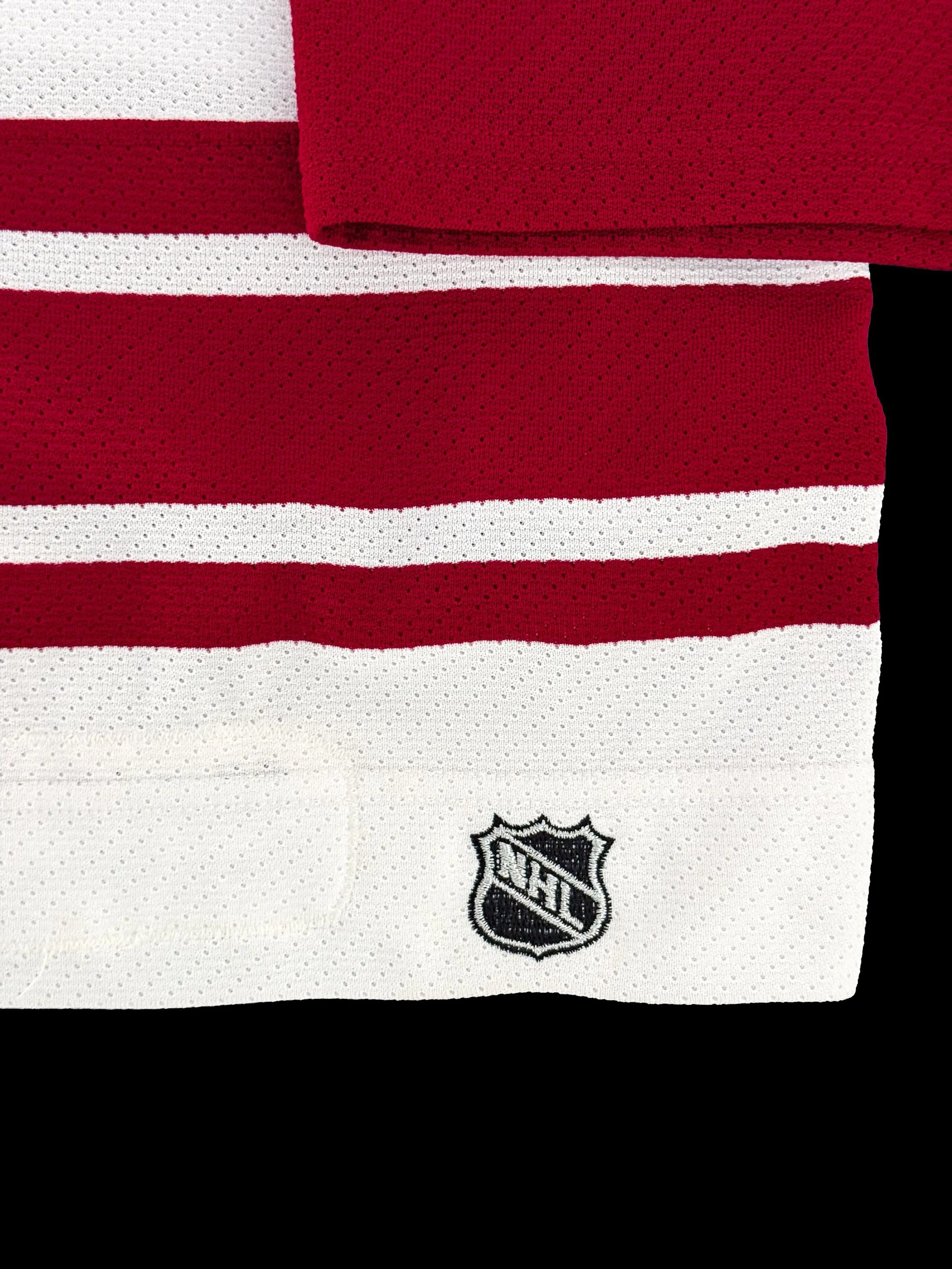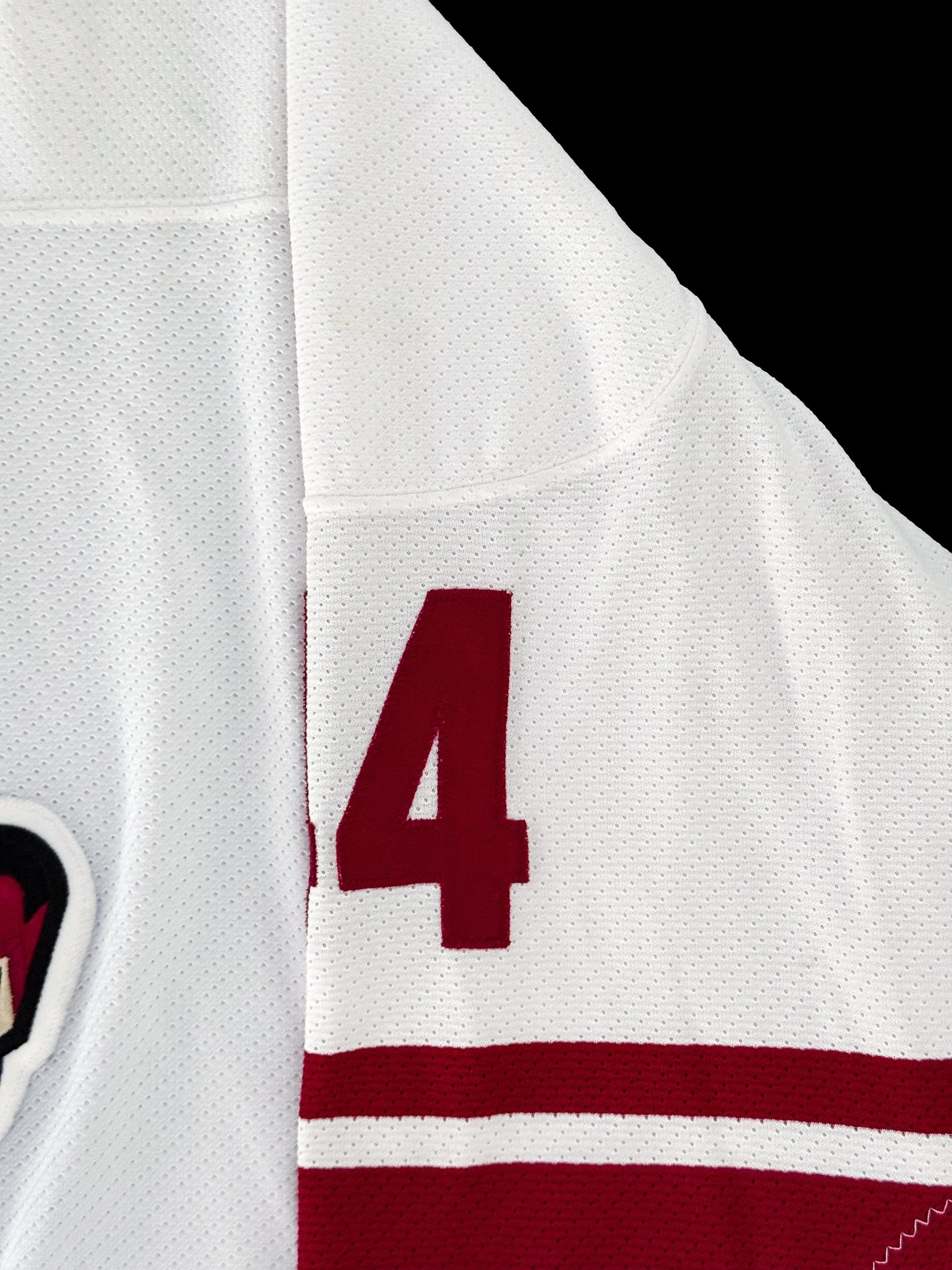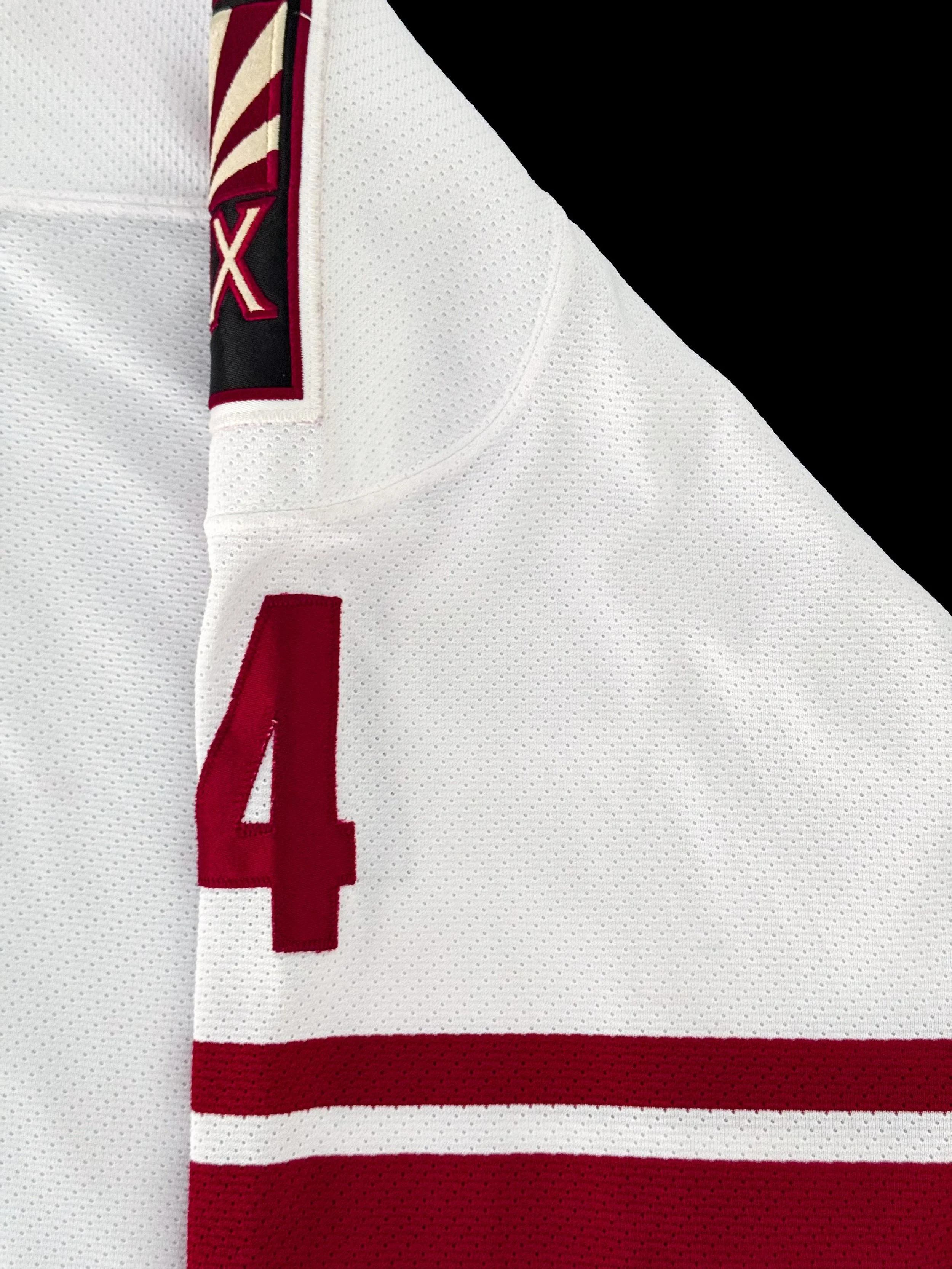 The Coyotes were also in the first year of their rebrand from the kachina to the howling coyote and brick red and white. While the kachina eventually won out as the favored logo and look of the two, these white jerseys with the brick red stripes remain my favorites of the howling coyote era.