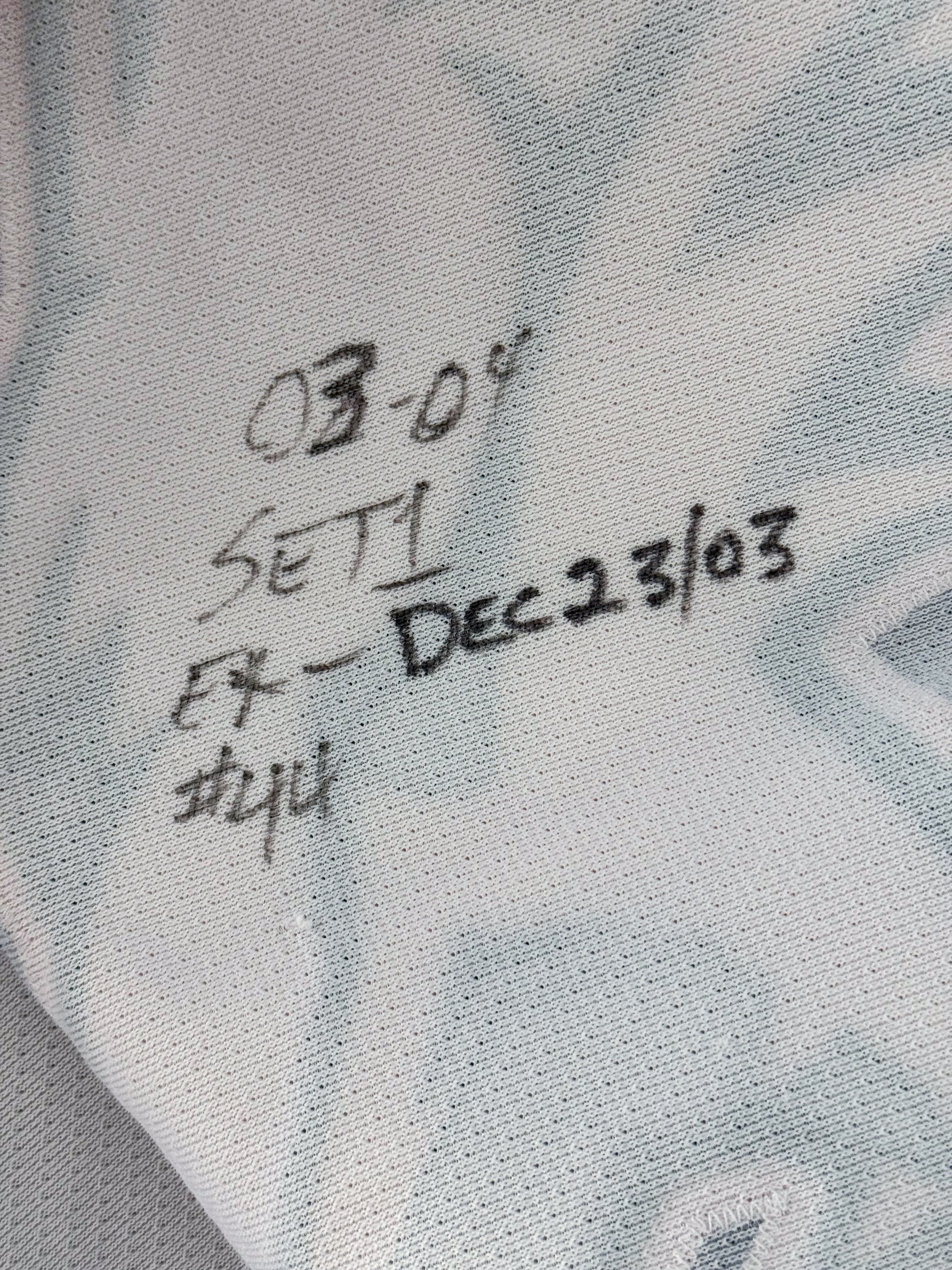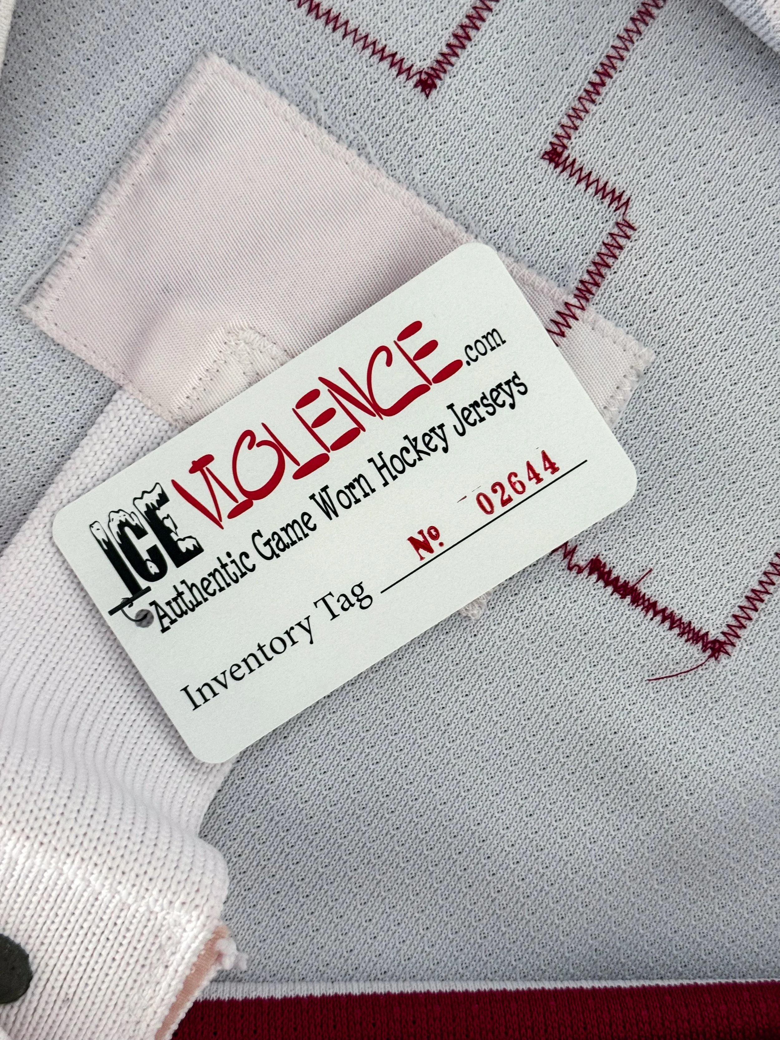 Nazarov’s jersey shows some wear with stick/puck marks, a mangled collar/neckline, and some wash wear. The jersey is customized with an extra coin fight strap in the front below the crest.