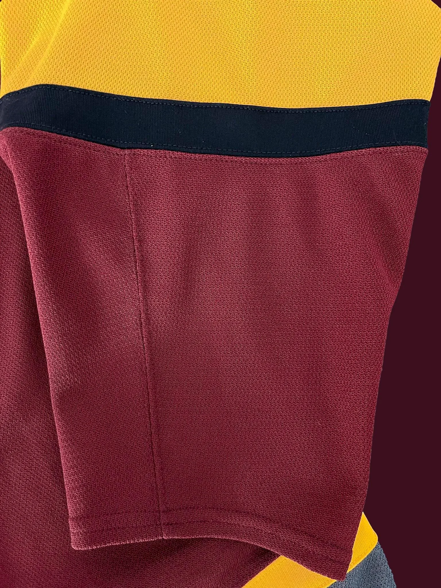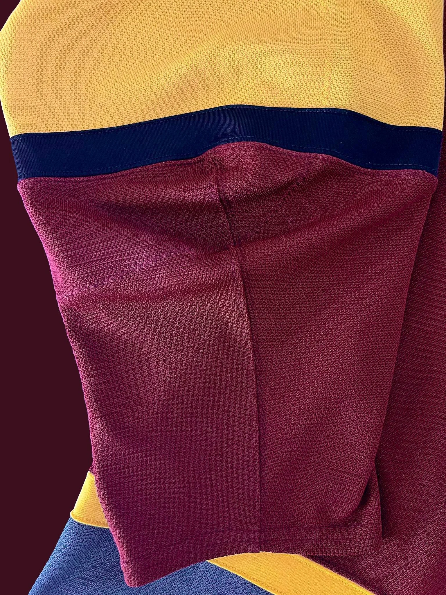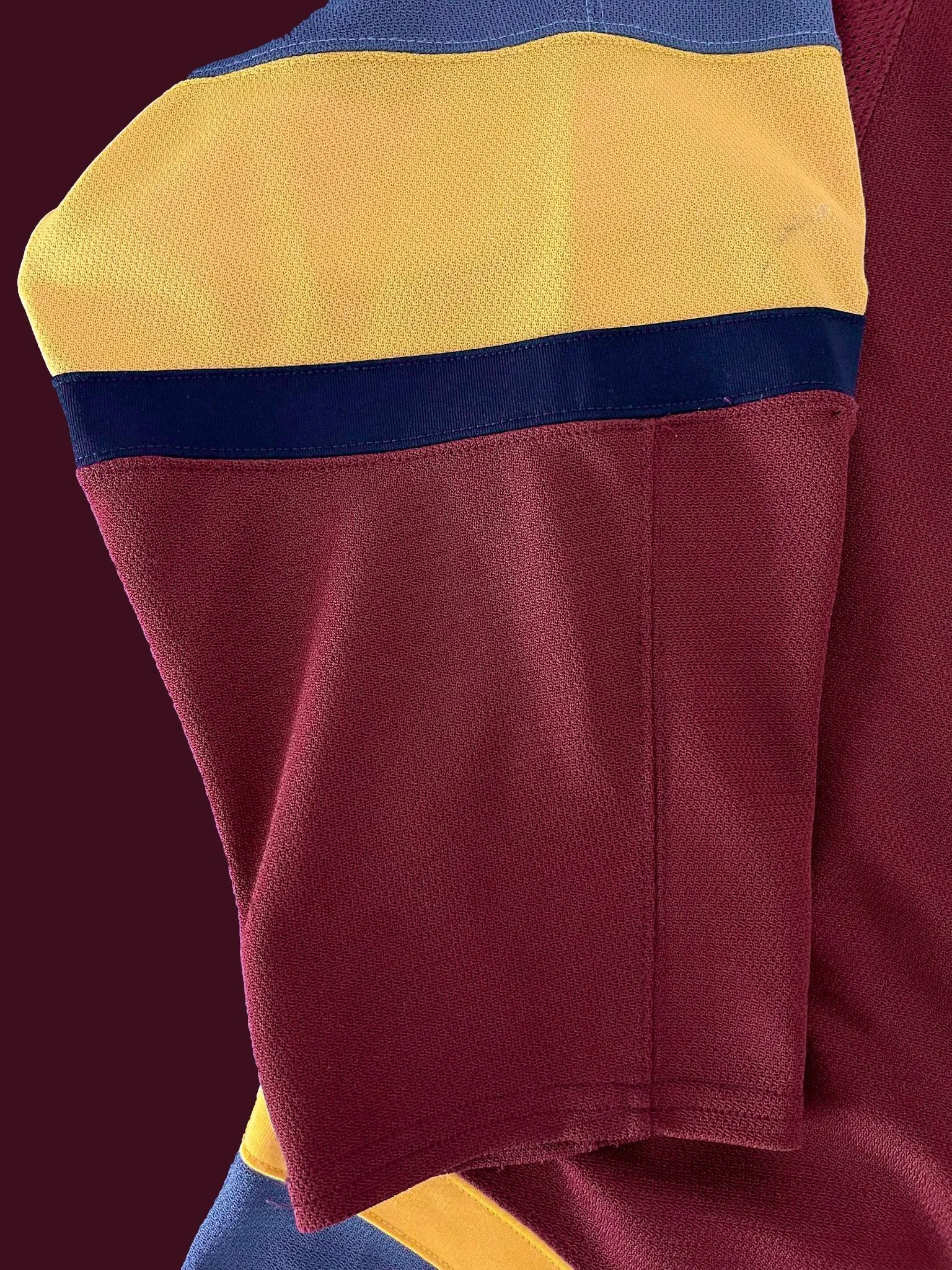 Croston’s jersey has solid wear with a few burns in the right sleeve and loose threads on the sleeve numbers. The left sleeve has much of the wear, with burns and several repairs clustered in and around the black band that separates the yellow and maroon areas of the sleeve. That cluster of repairs has been photomatched to the Quinnipiac tournament game above. The left sleeve has some loose threads and a slash mark on the #1 of the sleeve numbers.