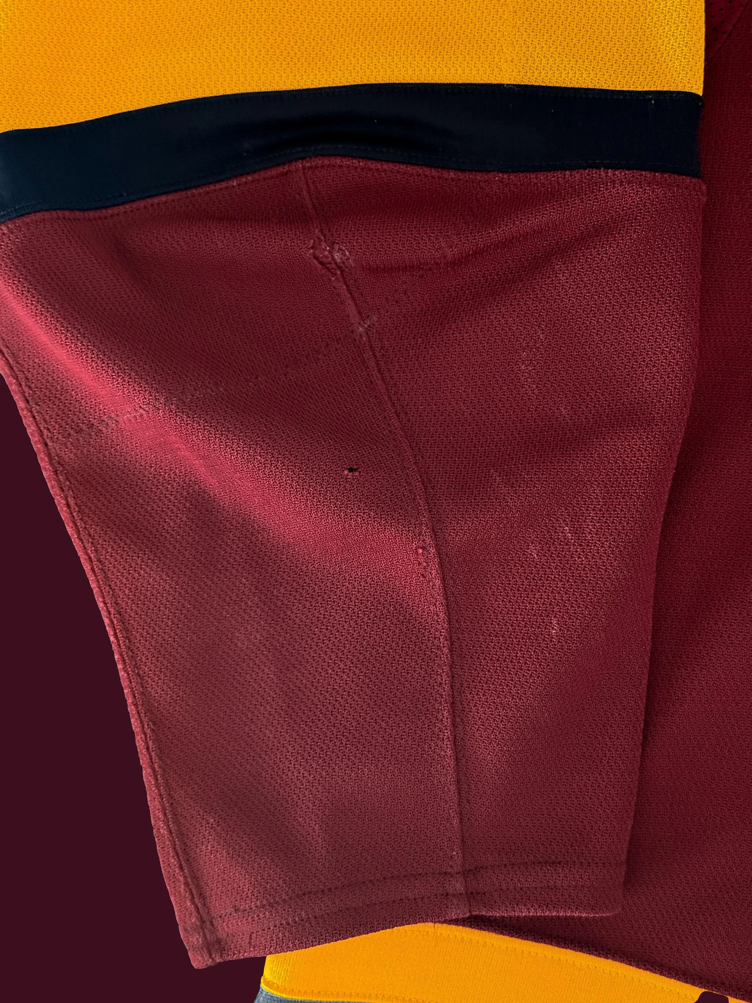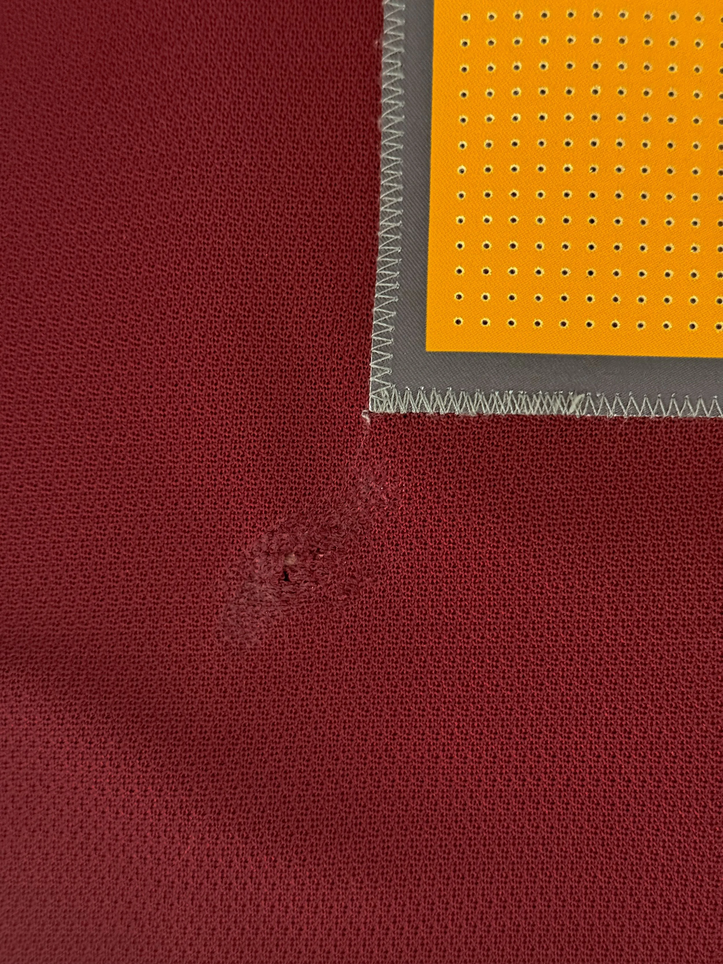 Below the numbers on the lower left hand side of the jersey is a large silver dollar sized burn that is also an unrepaired hole in the center.