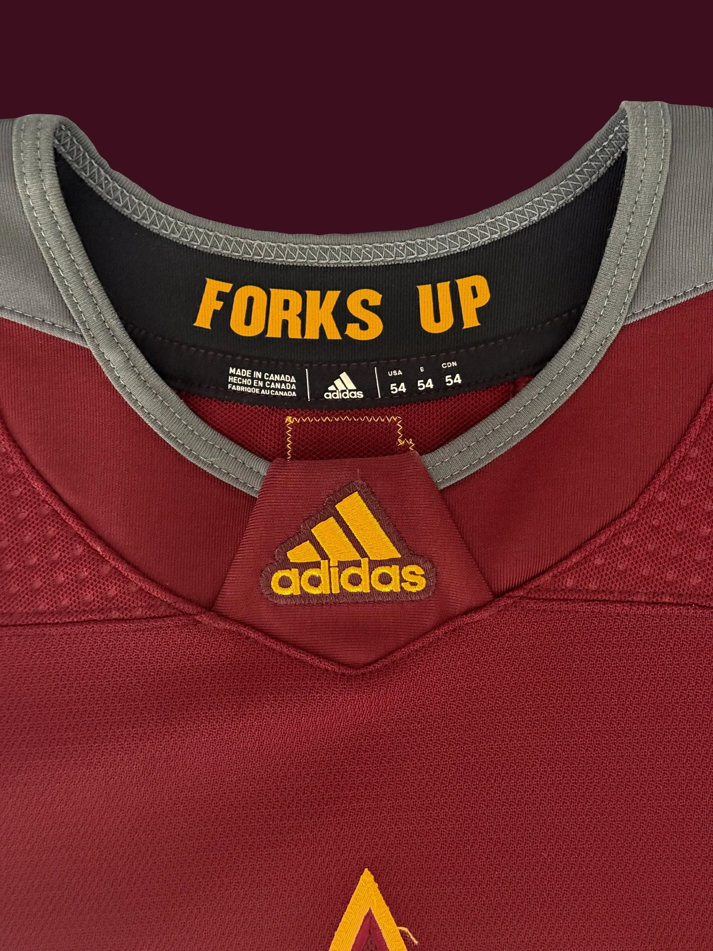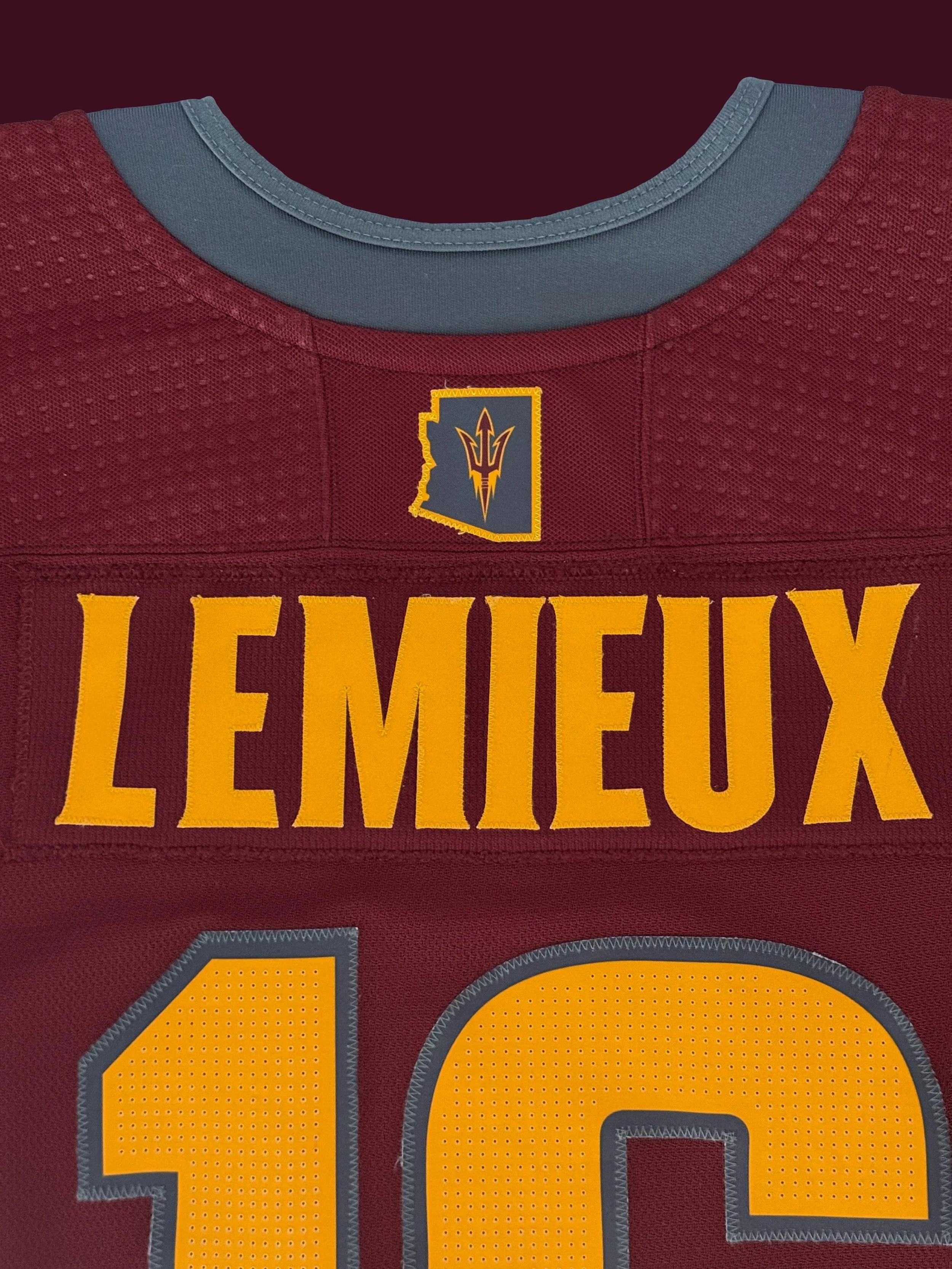 On the crest, there is a loose thread at the top of the pitchfork that has led to the only photomatch of the jersey I’ve found. There simply aren’t very many photos of Lemieux at ASU out there, and most of those have him wearing the white sweater.