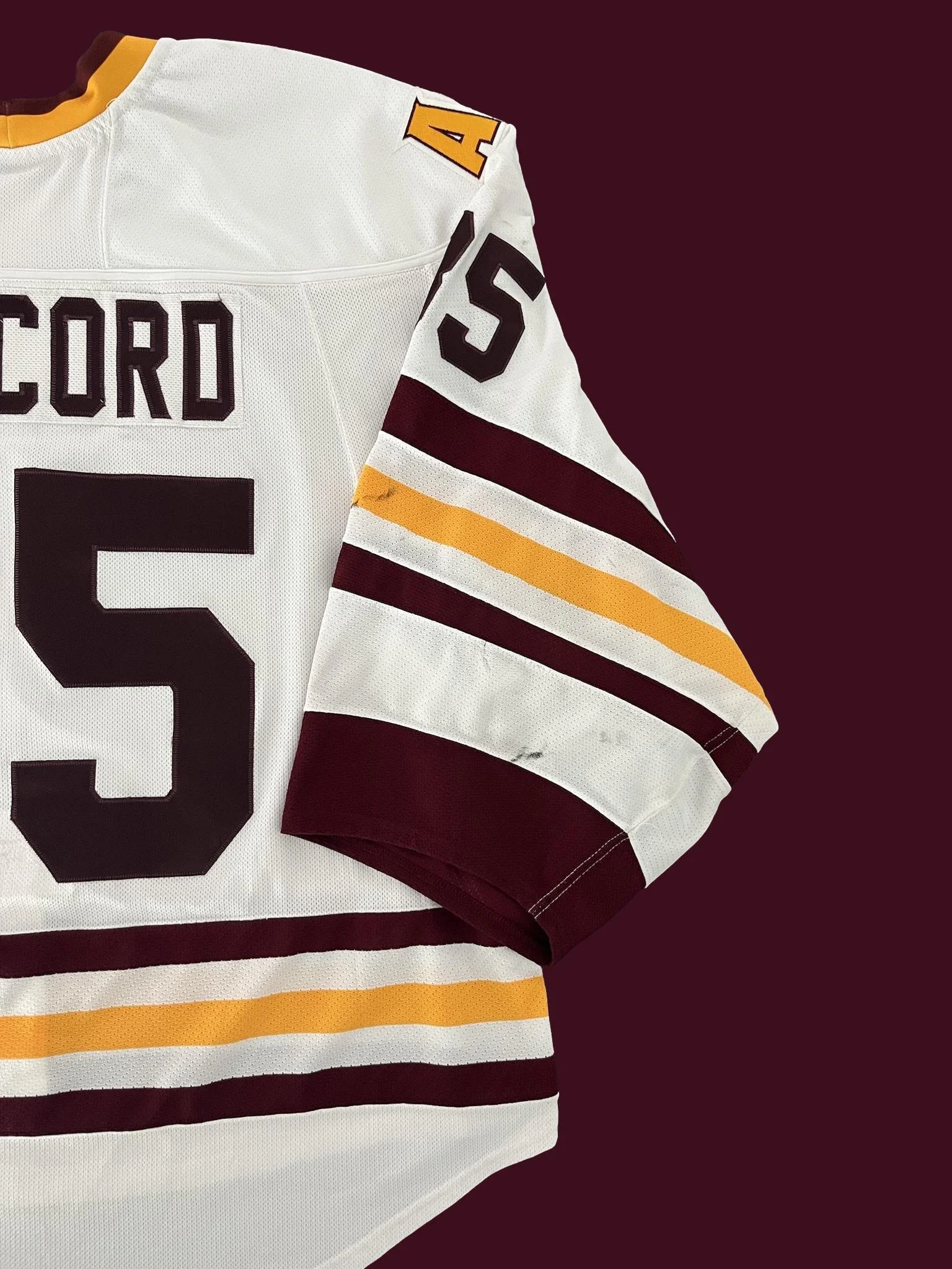 These sweaters feature a different style numbering from the double-layer twill maroon and gold numbers the school wore previously. These numbers on both the black and white jerseys were single-layer twill. The black jerseys had all yellow numbers and the white had all maroon numbers.