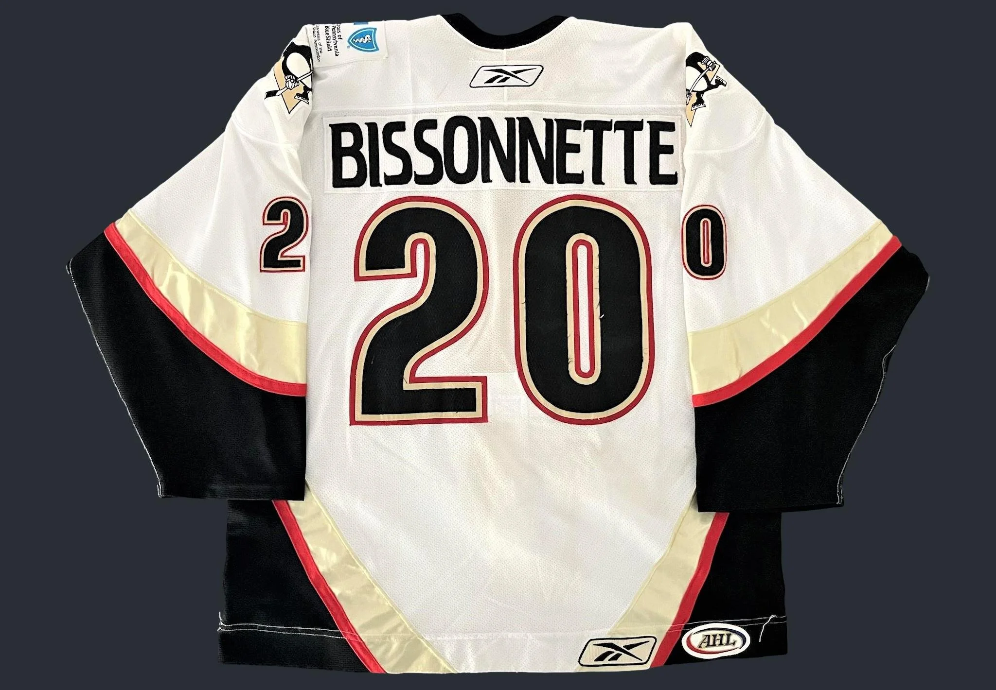 The front of the jersey has some stick marks above the crest. One above the head of the crest is still very dark, and the other above the penguins’ bicep has lightened with repeated washings. The mark above the crest’s arm is visible in at least two photos of Bissonnette from that season.