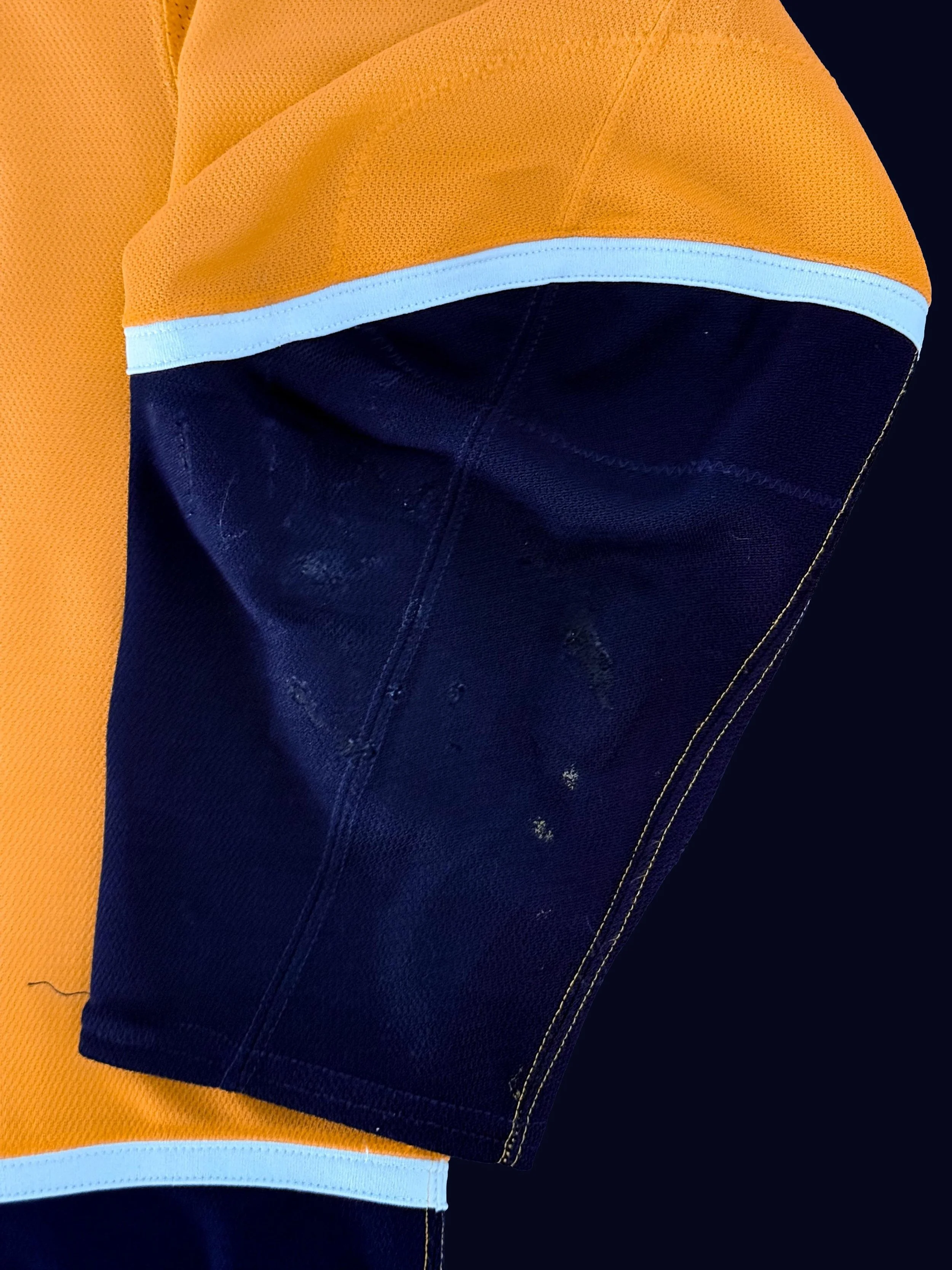 The back shows two stick marks on the left hand side, both next to the back #5. There is a small repair where the tracking device was placed or removed at the shoulder, and another small repair below the fight strap.