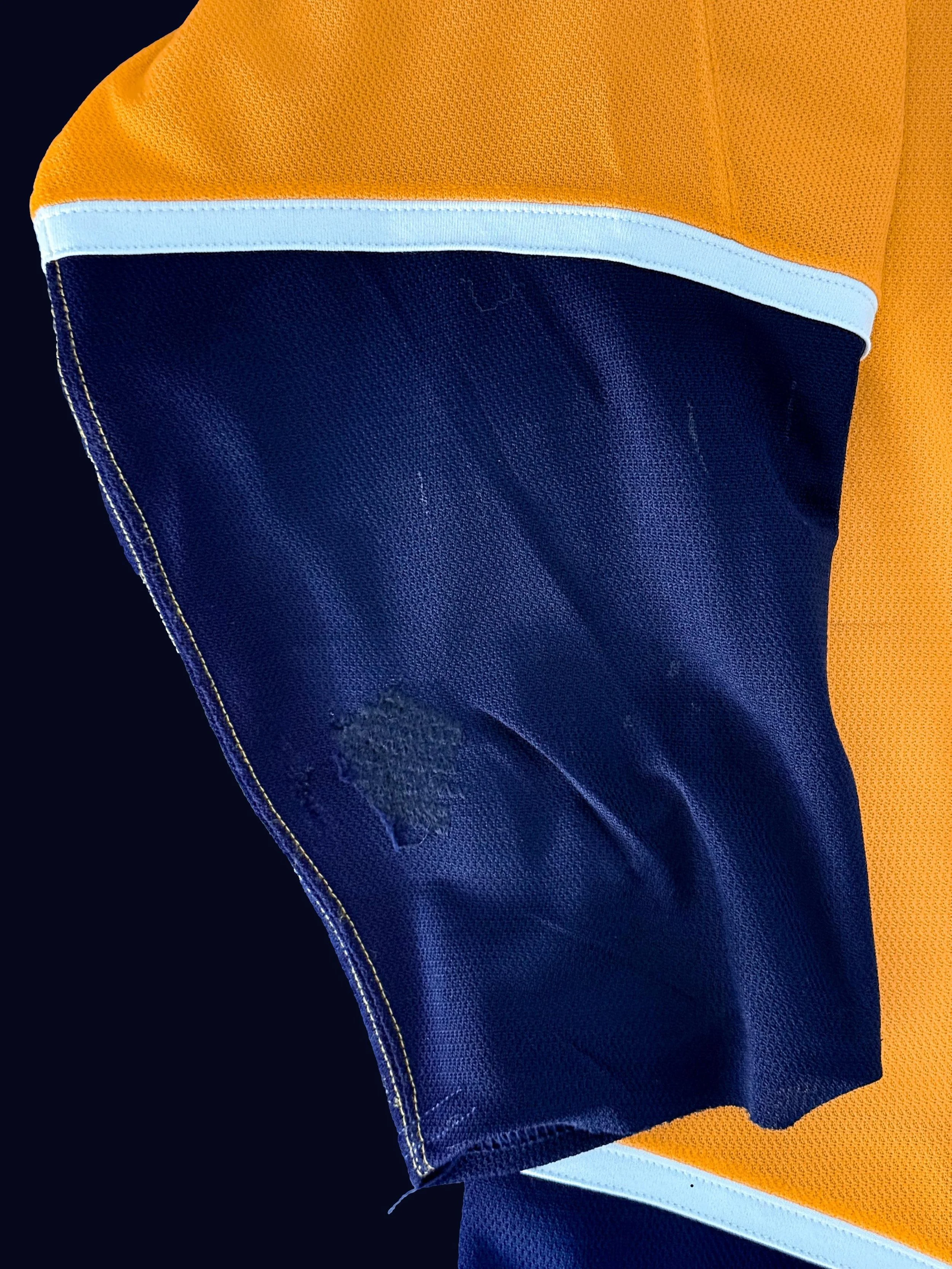 The arms of the jersey are pretty hammered by modern jersey standards with 10 repair patches and several other sewn repairs, including two fairly large repair masses. There is also a solid amount of board burns in both sleeves.