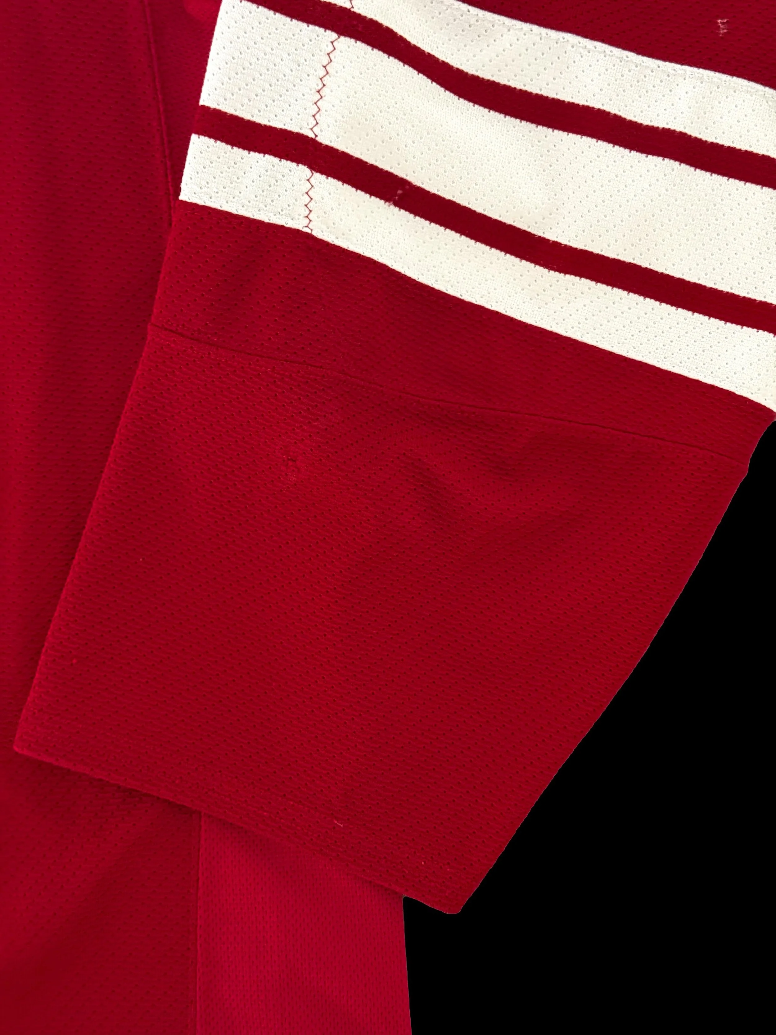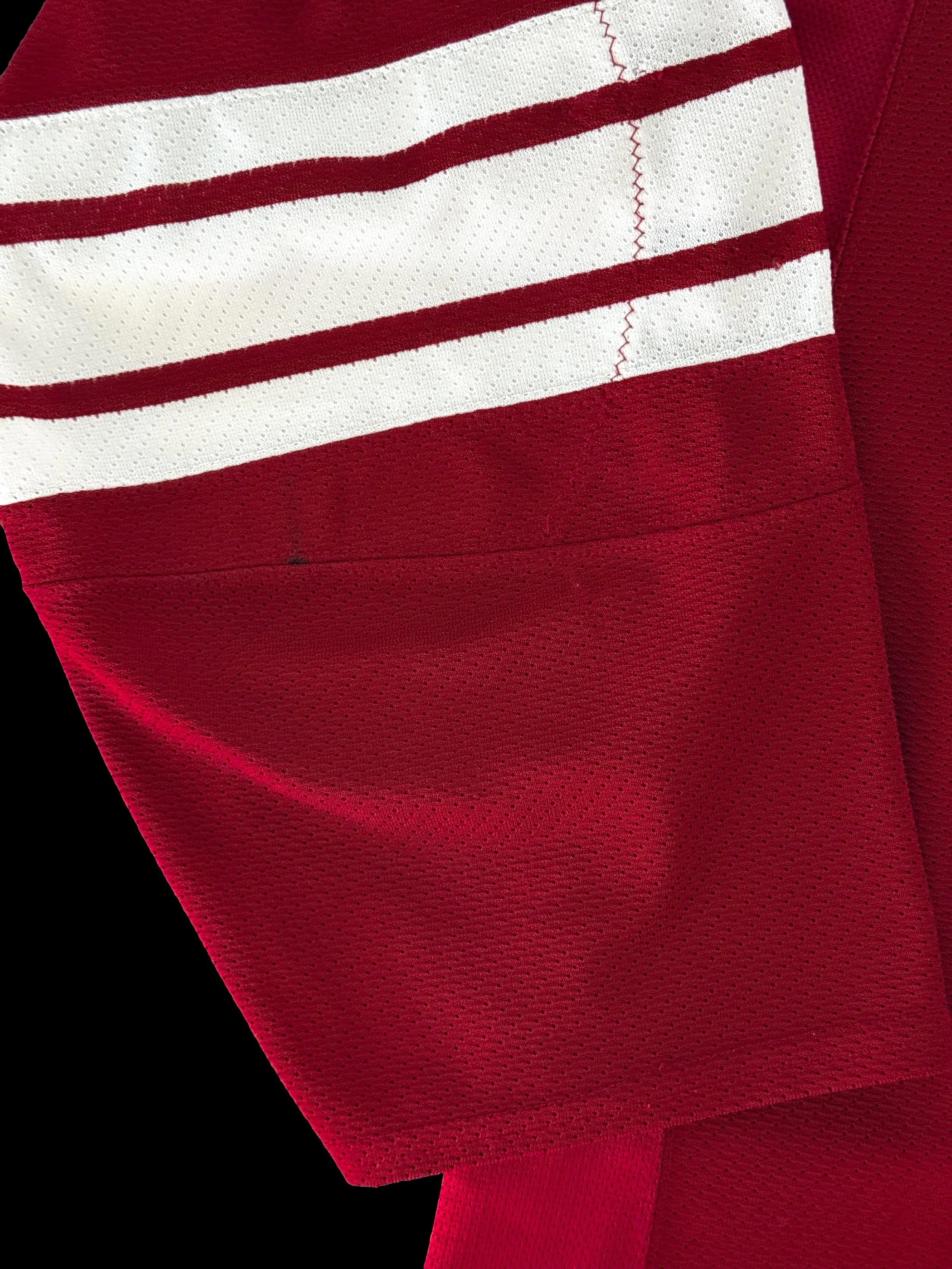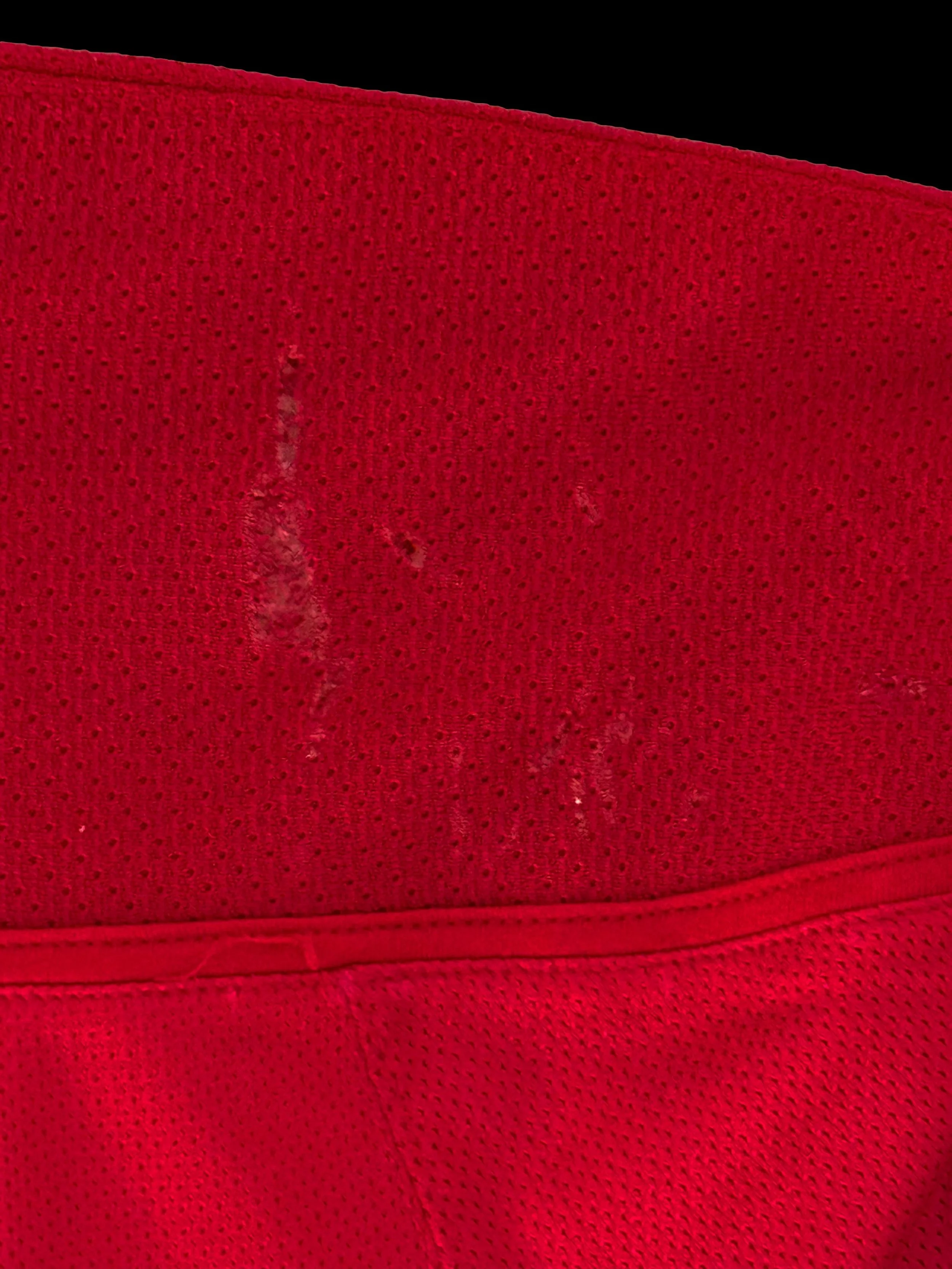There are also board burns, another set of large burn holes above the right sleeve number, some very light stick marks, and an interesting stray red thread stitched into the middle of the crest