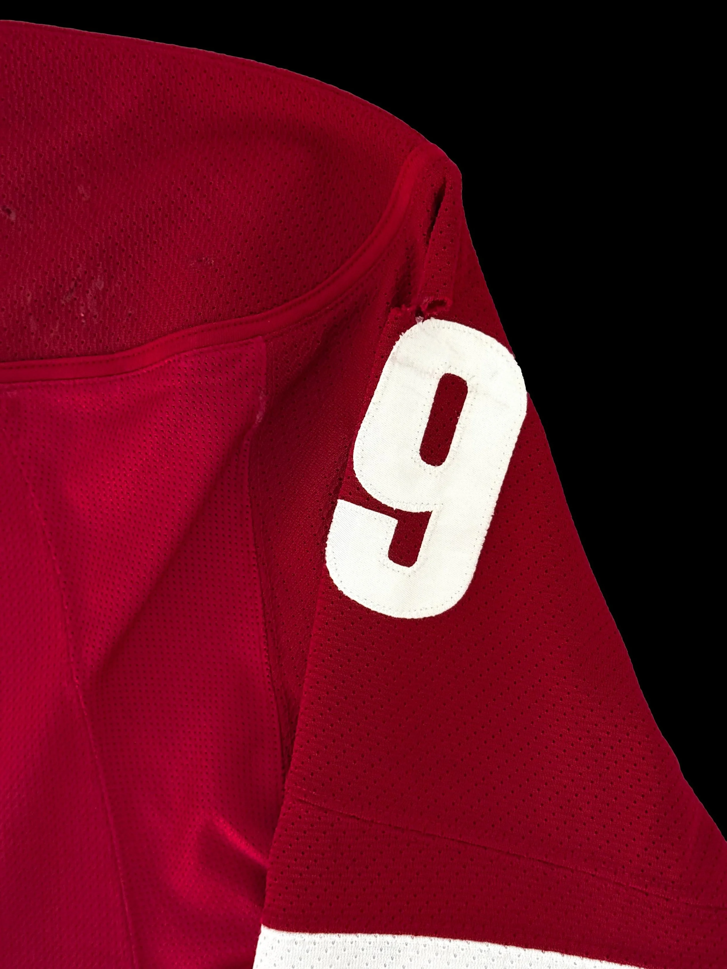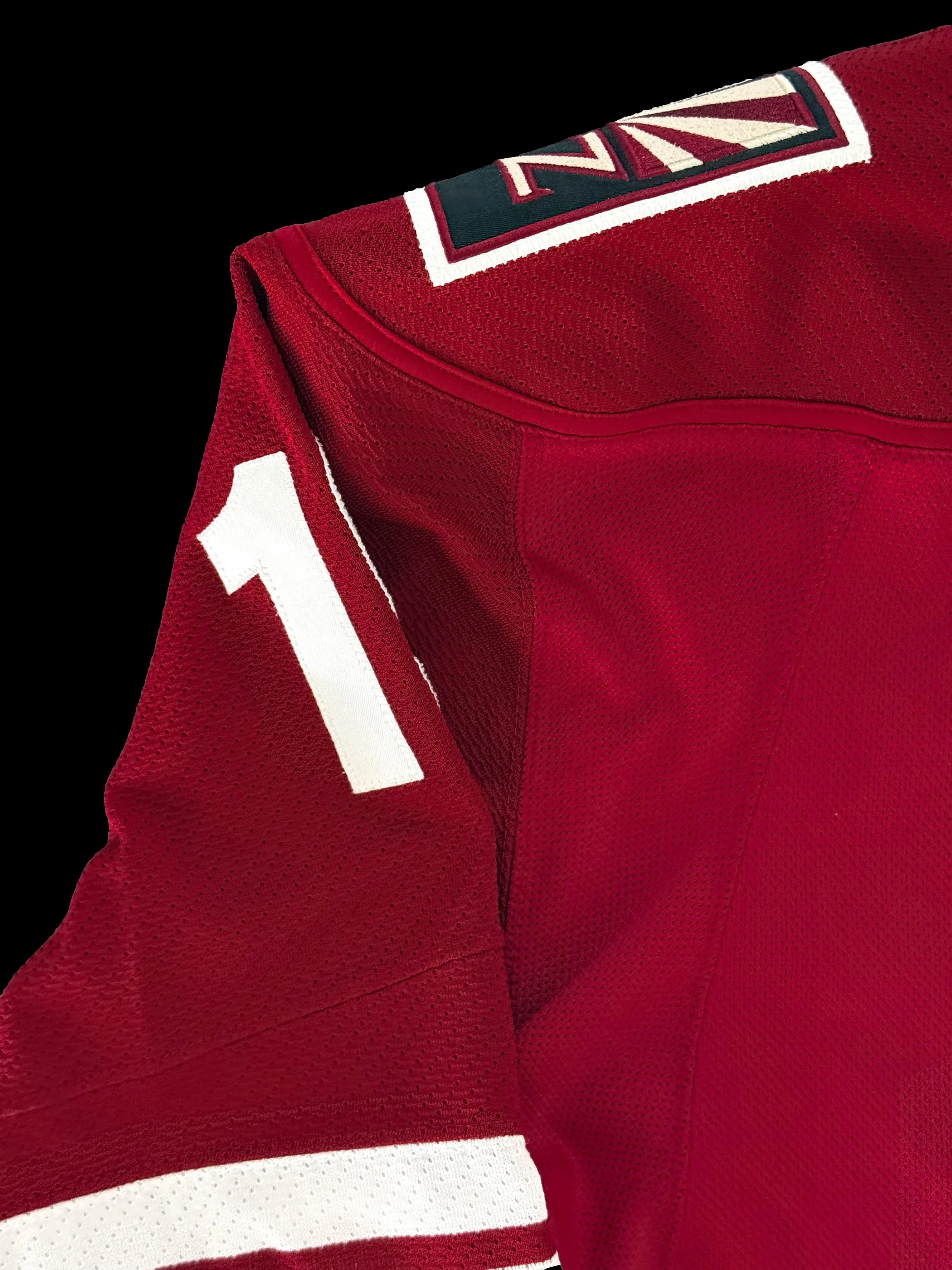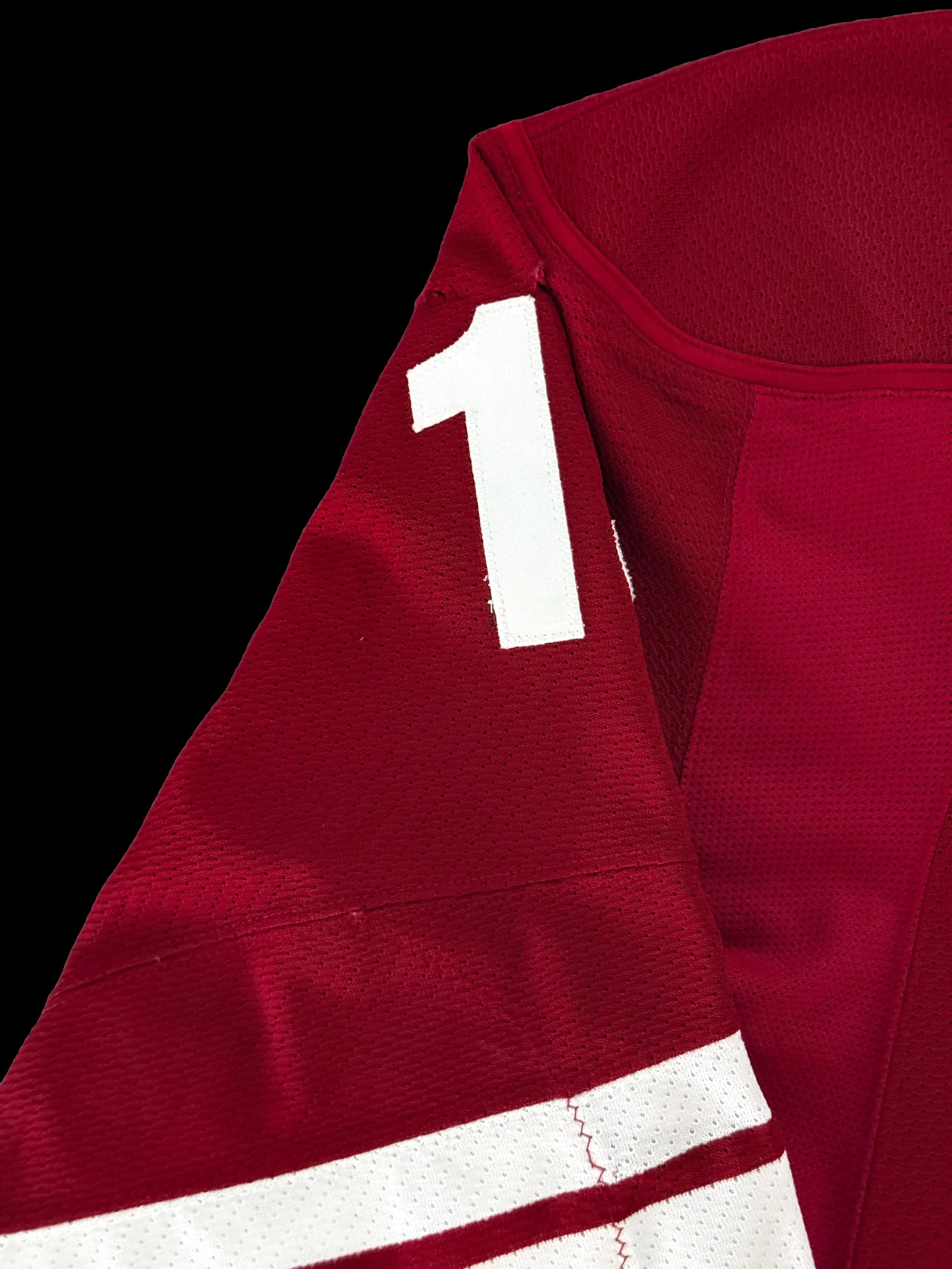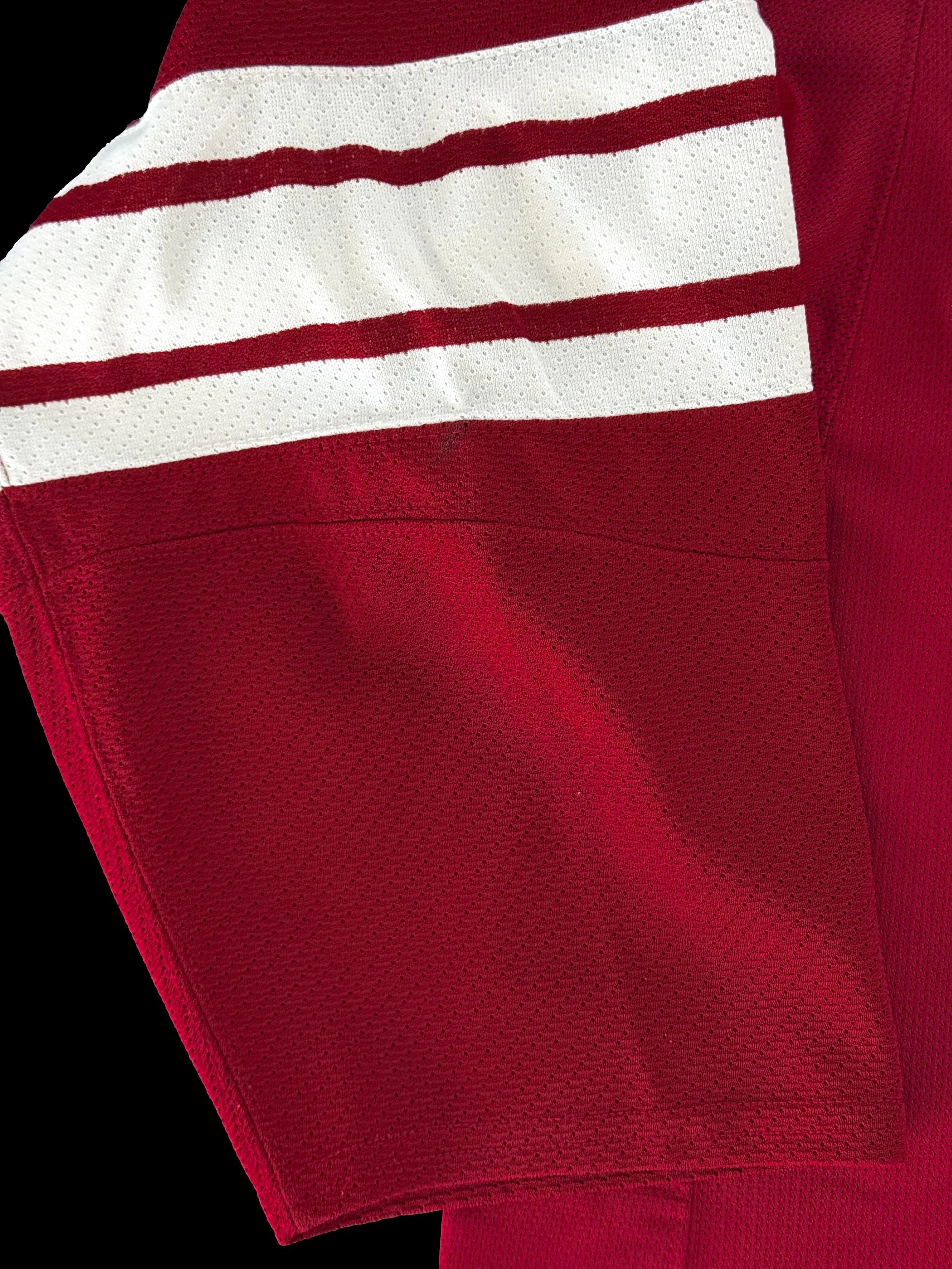 There are also board burns, another set of large burn holes above the right sleeve number, some very light stick marks, and an interesting stray red thread stitched into the middle of the crest