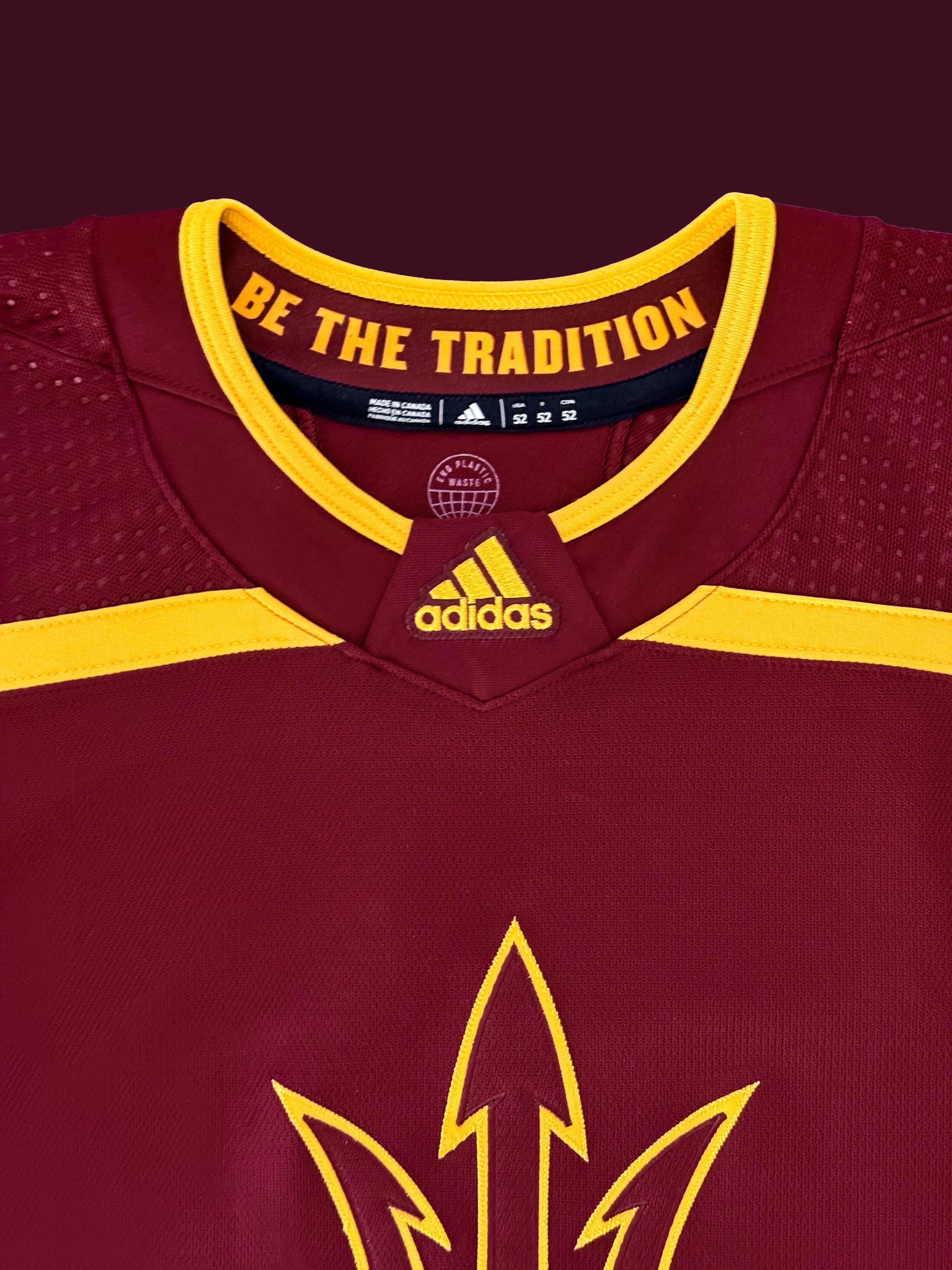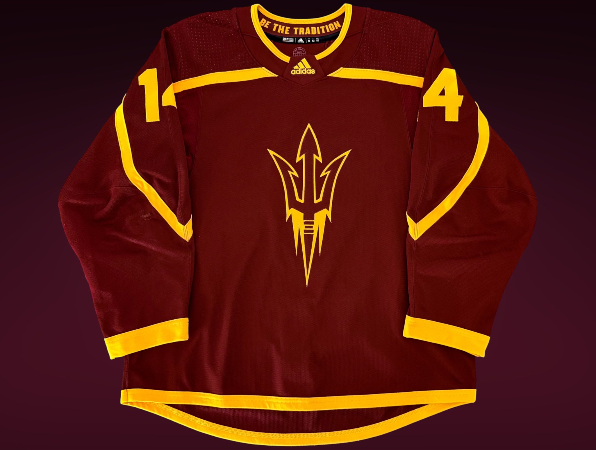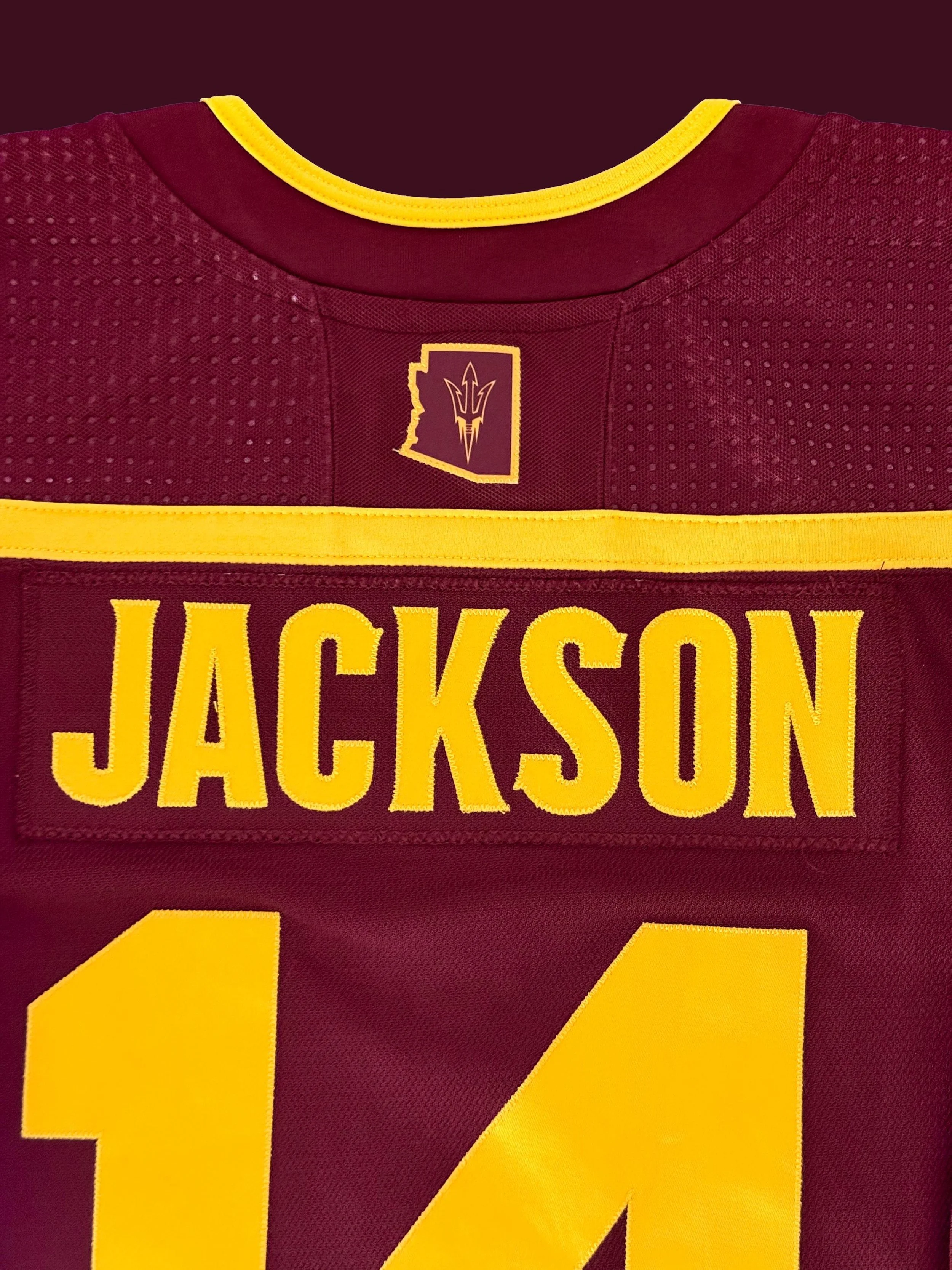 Jackson’s jersey lacks a set tag like virtually every other maroon set game worn jersey. Having spoken with the ASU staff, there was no discernible reason for the lack of a set tag; it seems to have just been overlooked when being customized by EPS.
