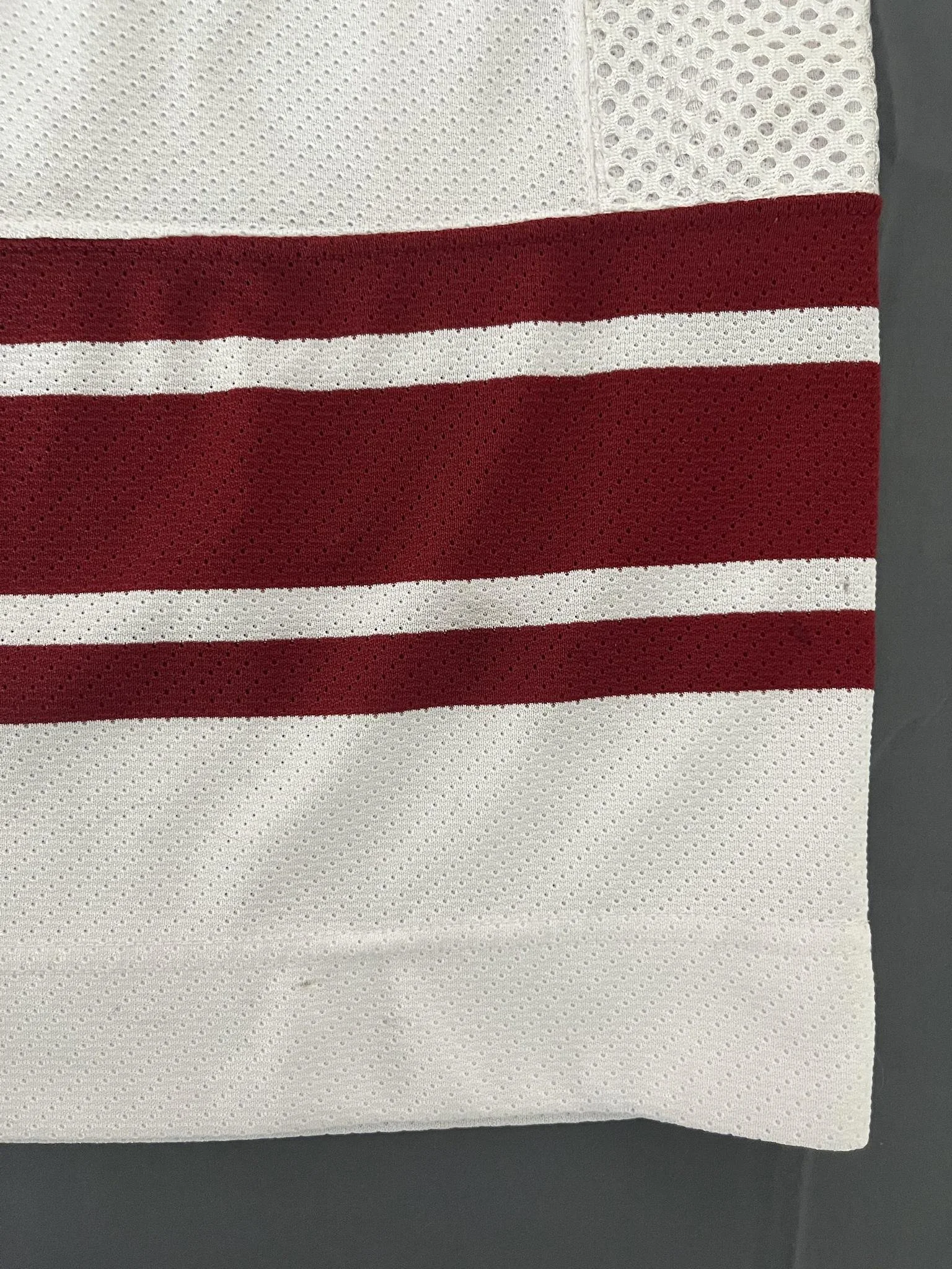 His White Set 1 jersey has moderate wear with stick and puck marks, paint transfer, a slightly mangled neck, collar and left shoulder, as well as one unrepaired cut.