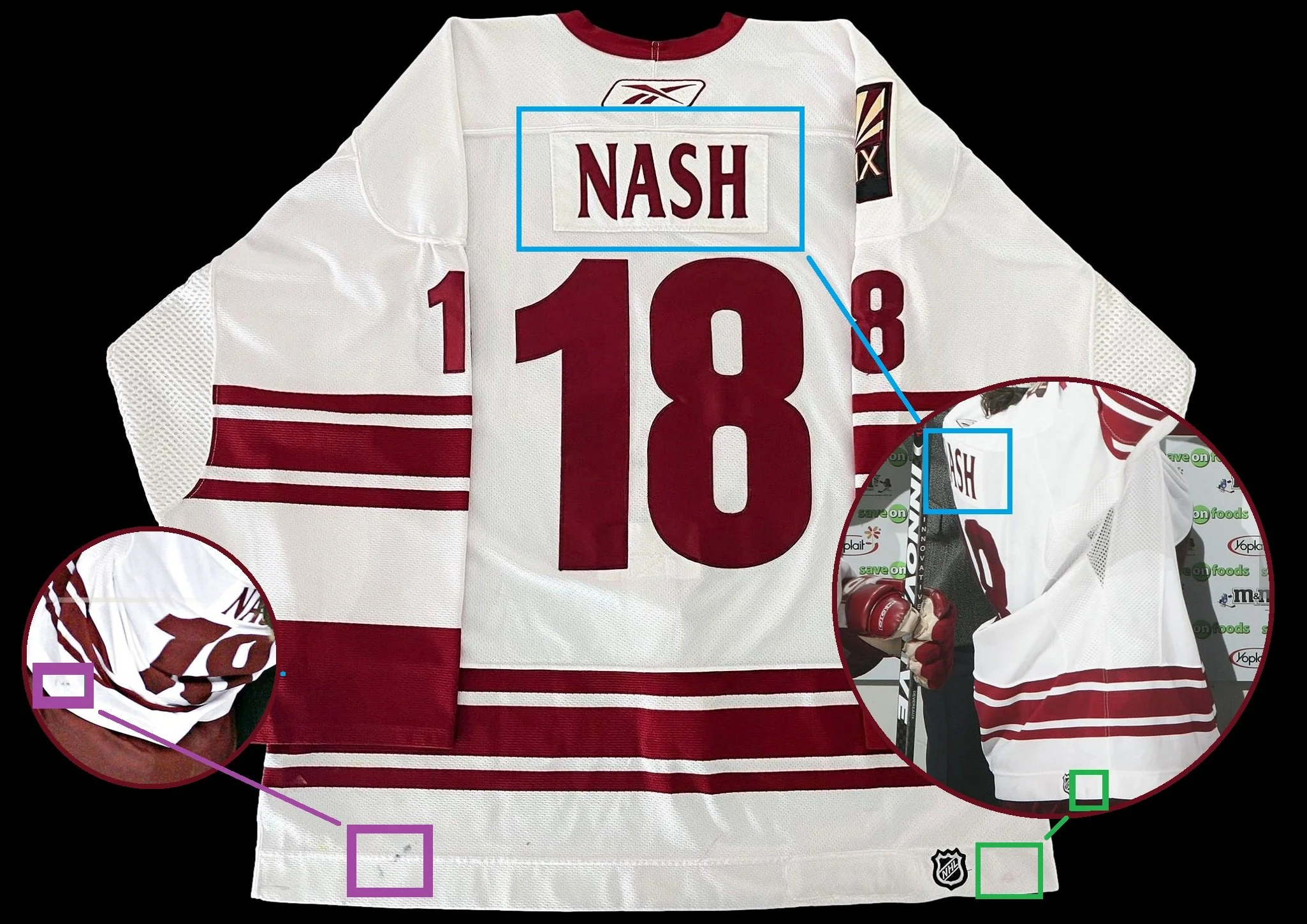 Tyson Nash’s game worn jersey features has Coyotes team tagging in the back hem.
